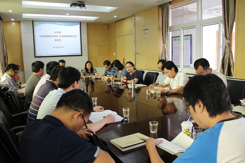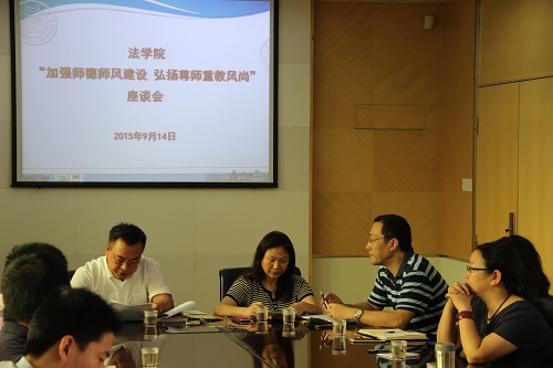2015年9月14日,正值新学期伊始,法学院于419会议室举行以“加强师德师风建设, 弘扬尊师重教风尚”为主题的新老教师座谈会。出席座谈会的有法学院党委书记李智勇、副院长林秀芹、朱炎生、李兰英,副书记周蕾,新老教师代表等。