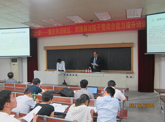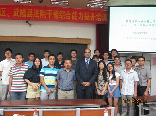 2014年6月12日晚在法学院B138教室,意大利布雷西亚大学的罗马法教授安东尼奥﹒萨克乔教授给我们带来了一场精彩而又有国际范的罗马法讲座,讲座的题目是“罗马法系中的扶养之债——历史、内容、义务人和发生根据”。为了体现原汁原味,萨克乔教授用他的母语意大利语进行讲座,由罗马法教研室将其讲稿翻译为中文并在屏幕上投影。法学院徐国栋老师是本场讲座的主持人,并在提问环节提供意大利语翻译。齐云老师、陈帮锋老师出席了此次讲座。