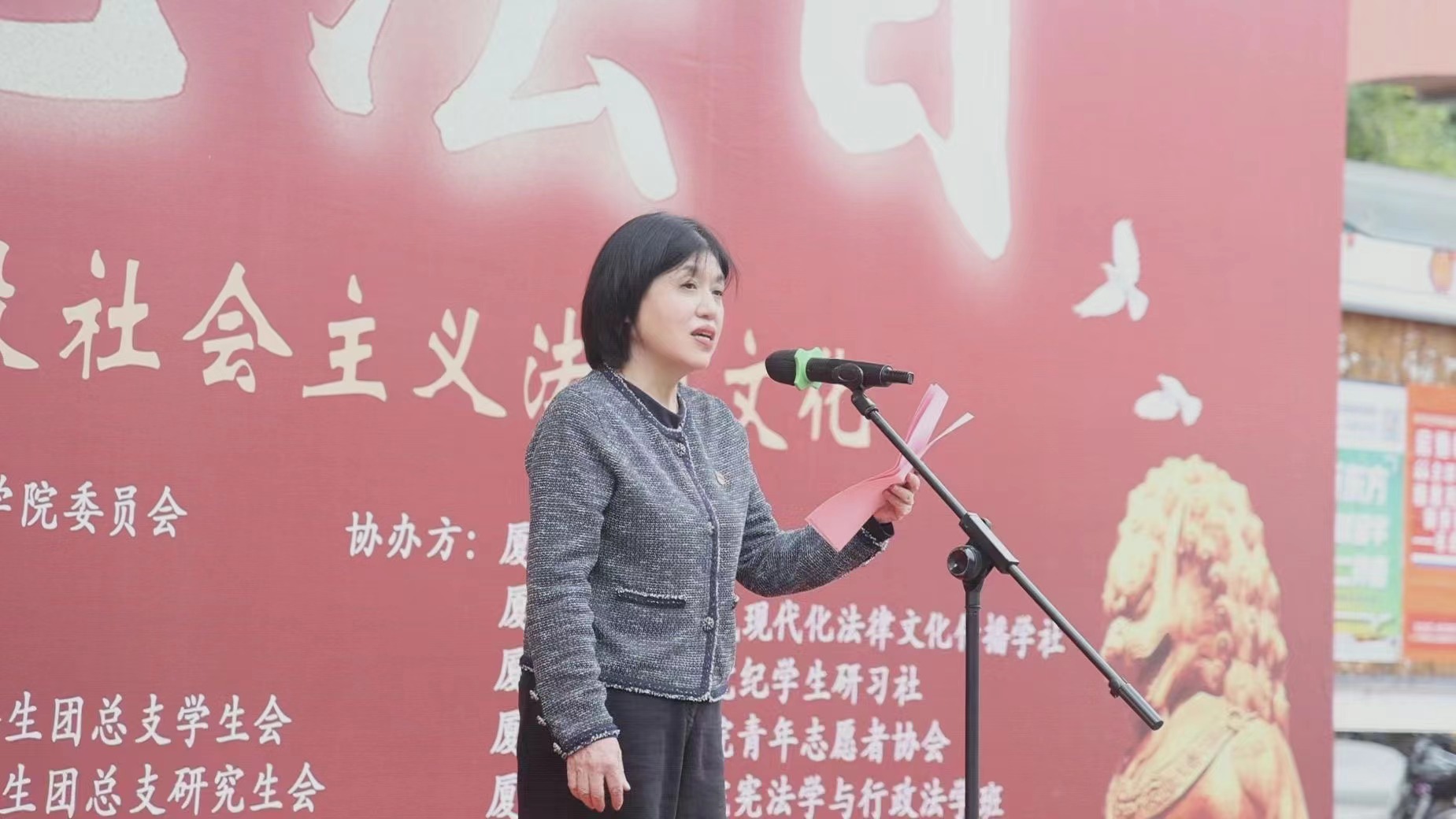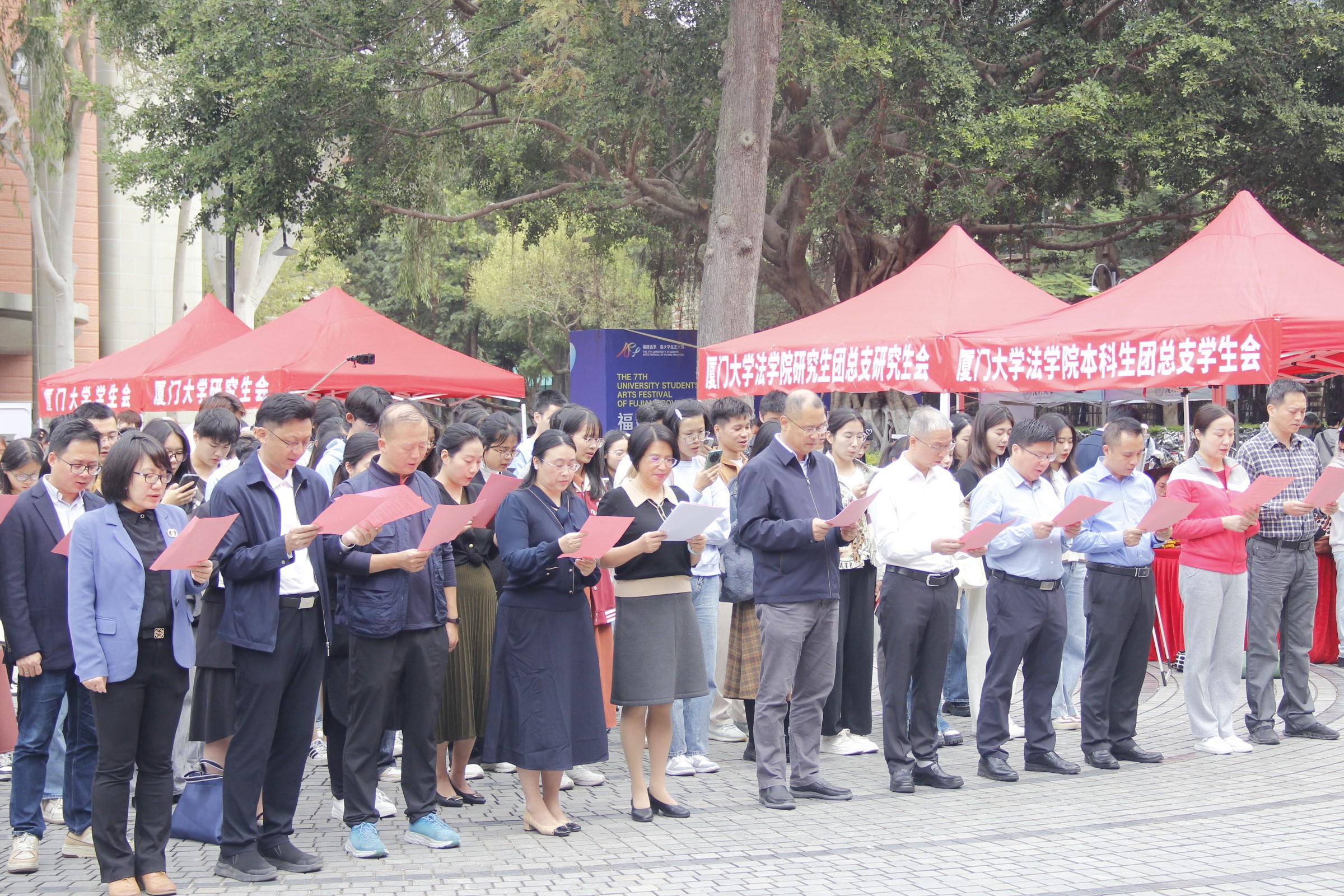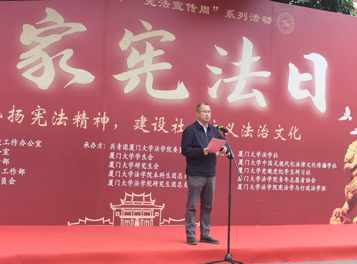 为深入学习贯彻党的二十大精神,贯彻落实习近平法治思想和习近平总书记关于宪法法治教育的重要指示精神,大力弘扬宪法精神,建设社会主义法治文化,在第十个国家宪法日即将到来之际,12月3日上午,厦门大学2023年国家宪法日主题宣传教育活动在思明校区三家村学生活动广场举行。厦门大学党委常务副书记林东伟,厦门市委机要保密局二级巡视员宋惠平,校纪委副书记、依法治校工作办公室主任刘宁,校党建办主任、党委组织部副部长葛郝锐,校团委书记洪海松,法学院院长宋方青,校办公室副主任兼保密办公室副主任袁国柱,校党委宣传部副部长杨机像,校党委学生工作部副部长刘俊英出席本次活动。活动由法学院党委书记何丽新教授主持。