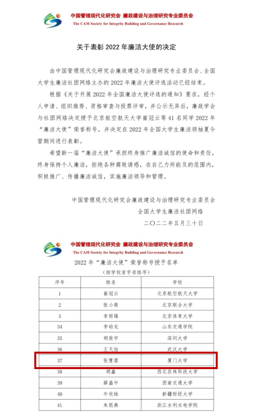 5月30日,由中国管理现代化研究会廉政建设与治理研究专业委员会,全国大学生廉洁社团网络主办的2022年廉洁大使评选结果公布,厦门大学法学院张慧蓉同学荣获2022年“廉洁大使”荣誉称号。