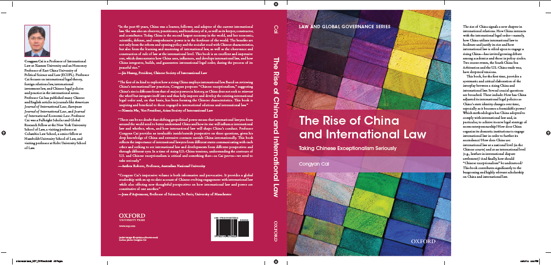 近日,蔡从燕教授的个人专著The Rise of China and International Law: Taking Chinese Exceptionalism Seriously正式由牛津大学出版社出版,全书包括八章,共360页(含索引)。该书是中国法律作者在牛津大学出版社出版的少数几本著作之一,作者也是继牛津大学国际法博士、清华大学贾兵兵教授和剑桥大学国际法博士、西安交通大学单文华教授之后在牛津大学出版社出版著作的第三位中国国际法学者。在该书中,作者立足对于国际法律理论与实践、国际关系理论、法社会学、中国国际法政策与实践以及中国法律文化的理解,从国际法律秩序的结构性变迁对中国崛起的影响、国家身份变迁与识别对中国国际法律政策的影响、制度、组织、司法实践以及国际争端解决中的法律战的角度,对于中国崛起与国际法律秩序之间的互动进行了富有个人研究特色的讨论。该书是作者从2010年以来致力于研究崛起中的中国与国际法律秩序互动的一个阶段性成果,部分思路与内容体现于作者发表于《法学研究》、《中国法学》、American Journal of International Law, European Journal of International Law等刊物的论文以及作者应邀参与的多个国际写作项目中。2015年下半年,作者向牛津出版社提交出版申请。经过八个月的内部评议与外部同行专家评估,牛津大学出版社于2016年年中与作者签订出版合同。2019年初,作者提交书稿。经牛津大学出版社学术与市场部门评估,获得良好评价,书稿达到出版标准。