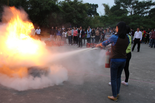 灭火器是进行防灾抢险的重要工具之一,在本次演练中,大一、大二每班15人和研究生代表、教师代表、物业代表一起,在消防人员的指导下,分为7组参加油火扑灭演练。面对熊熊燃烧的火堆,大家表现十分积极勇敢,按照灭火的步骤和方法,将火堆燃起的浓烟大火迅速扑灭。
