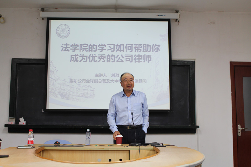 2017年1月11日晚19:00,一场主题为“法学院的学习如何帮助你成为优秀的公司律师”的专题讲座在我院B520举行。本次主讲人为戴尔公司的全球副总裁及大中华区总法律顾问刘激先生。我院何丽新老师也参加并主持了本次讲座。