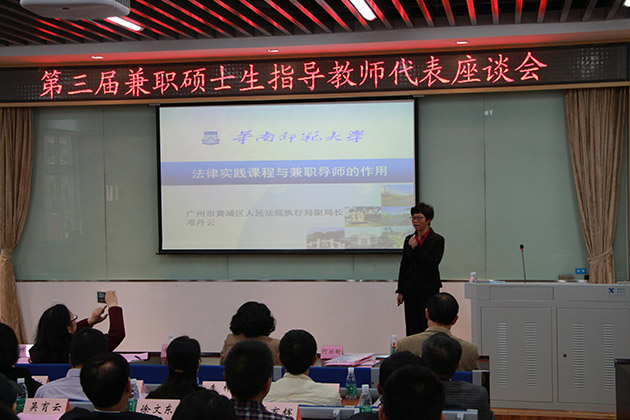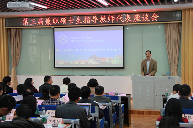 2015年12月12日下午,厦门大学法学院、厦门大学知识产权研究院第三届兼职硕士生指导教师代表座谈会暨专题讲座于法学院B137召开。与会人员包括厦门大学研究生院副院长陈工,厦门大学法学院党委书记李智勇,广州市黄埔区法院执行局副局长邓丹云法官,厦门大学法学院副院长何丽新、李兰英,以及厦门大学法学院、知识产权研究院的兼职硕士生指导教师代表、专任教师代表和同学。会议由法学院党委副书记郭锦星主持。