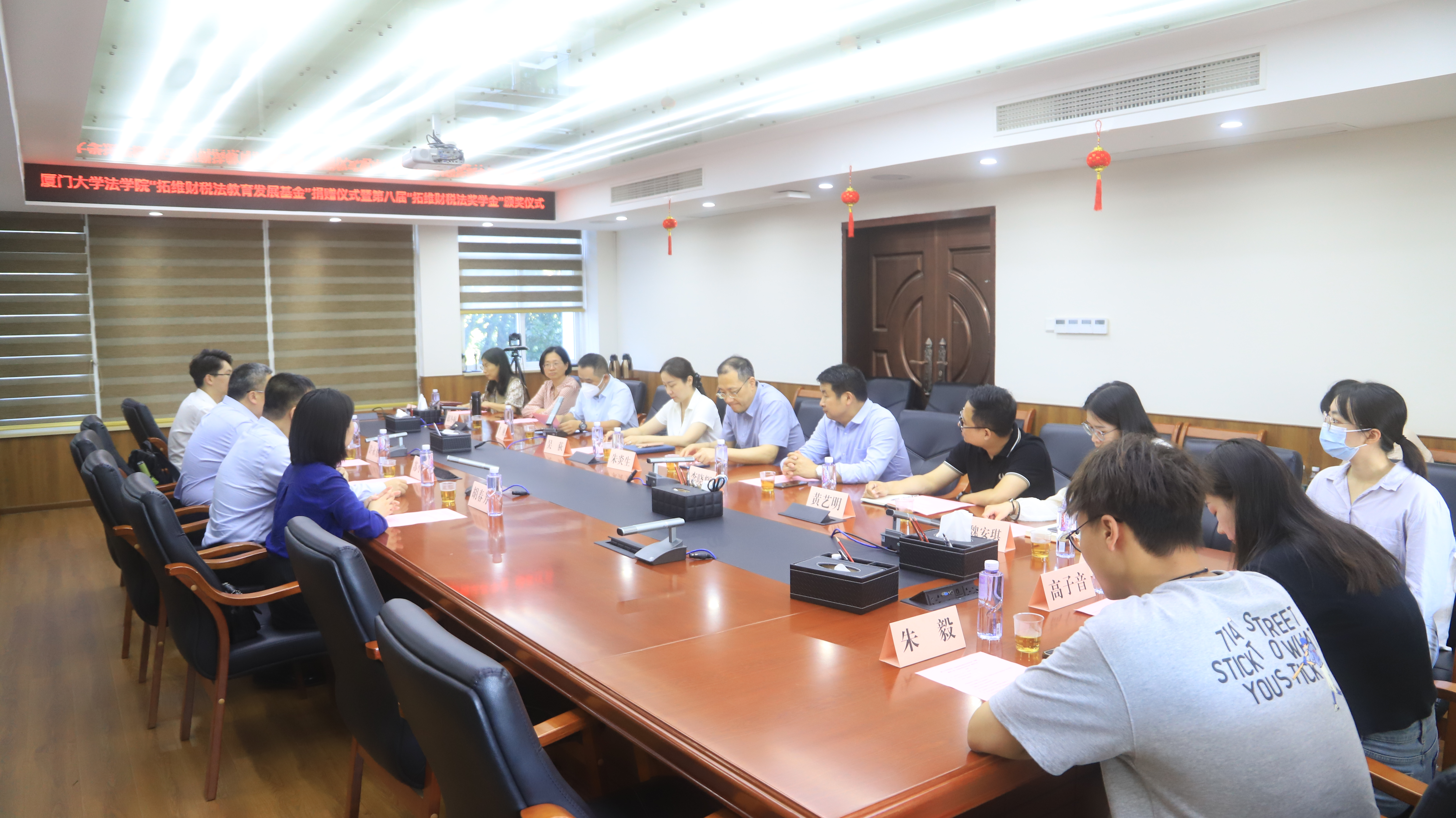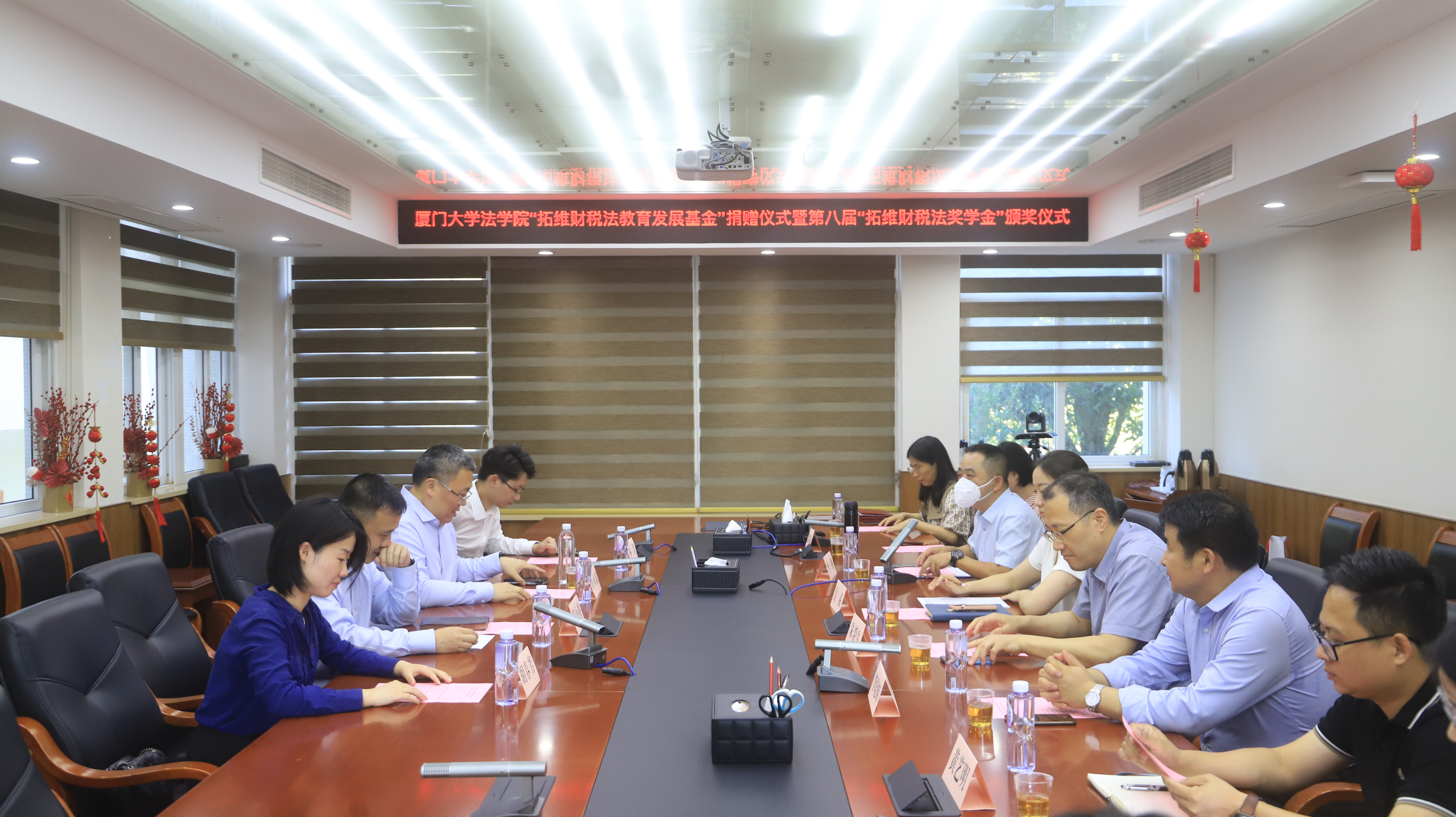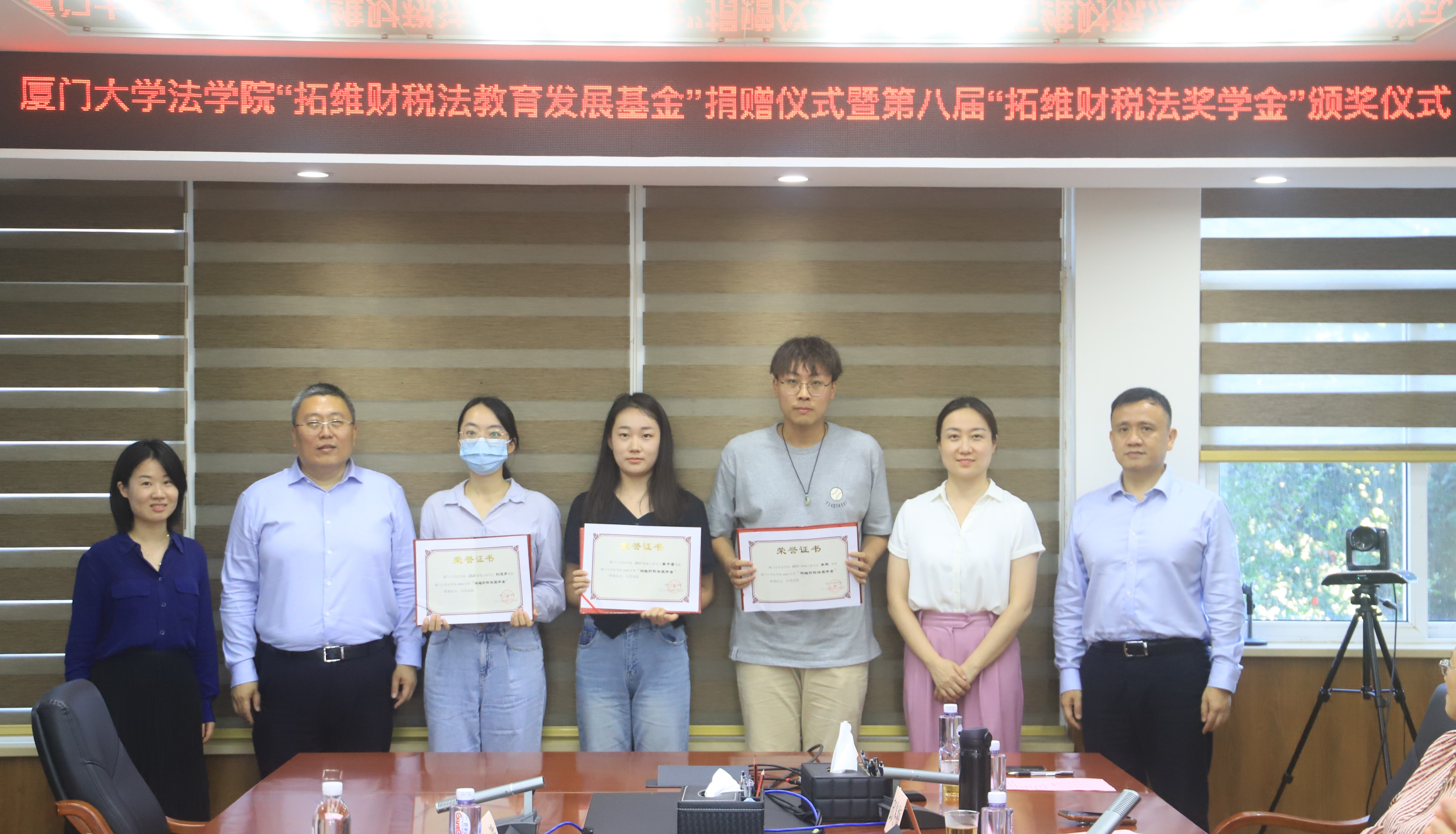 2023年5月29日下午,厦门大学法学院“拓维财税法教育发展基金”捐赠暨第八届“拓维财税法奖学金”颁奖仪式于法学院B220会议室举办。福建拓维律师事务所(以下简称“拓维律所”)首席合伙人许永东律师、高级合伙人苏小榕律师、合伙人胡春芳律师、主办律师林浩,厦门大学法学院党委副书记吴荻、厦门大学国际税法与比较税制研究中心(CITACT-XMU)副主任朱炎生教授、邱冬梅副教授、李晓辉助理教授,法学院团委副书记黄艺明、研究生辅导员卢魏安琪、校友事务秘书刘巧英老师及获奖学生代表等出席仪式。仪式由法学院财税法教研室主任李刚副教授主持。