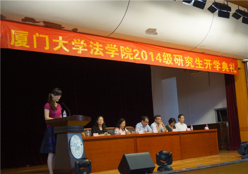 在党委副书记郭锦星老师的主持下,首先由徐崇利院长致辞,他表达了对2014级新生们的热烈欢迎,同时也寄语同学们要铭记厦门大学的校训“自强不息,止于至善”,努力奋斗,不做平庸之人。徐院长致辞结束后,由副院长林秀芹教授发言,她鼓励新生们在研究生阶段要处理好“专”和“全”的关系,尽情展示自己的学术风采,甚至是学霸风采,并提出两点希望:一是坚守自我,不随波逐流;二是全面培养知识和能力,时刻准备着为法治中国作出贡献。林教授和蔼的笑容、幽默的谈吐迎来了在场学子的阵阵掌声。紧接着由何丽新副院长发言,她表示静心读书是一种奢侈,希望每位同学都珍惜人生的精华时间去阅读、去感悟,对法律的领悟、学习到的法律精神将是伴随一生的财富。同时,何老师还告诫在座同学研究生阶段容易遇到挫折、容易迷茫、要制定好自己的人生规划、克服惰性,做精彩的自己。老师的教诲句句发人深省,让同学们都感受到了这位法学院最受欢迎的教师对学生们深切的关怀。魏磊杰作为教师代表发言,他以生动的实例和风趣的比喻提醒新生们要学会思考如何保持社会社会身份的转化,志当存高远,每一天都是生命中独一无二的一天,要不断奋斗,在有限的人生中充实生命的质量。