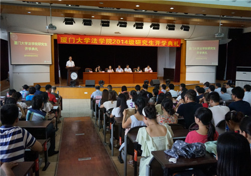 2014年9月17日上午8:30,阳光正好,夏意弥漫。法学院模拟法庭迎来了本院2014级的研究生新生。法学院院长徐崇利教授,院党委书记李智勇,副院长林秀芹教授、何丽新教授、朱炎生教授、李兰英教授,党委副书记郭锦星以及各教研室主任和各专业代表老师皆莅临现场。在雄壮的国歌声中,厦门大学法学院2014级研究生开学典礼正式拉开序幕。