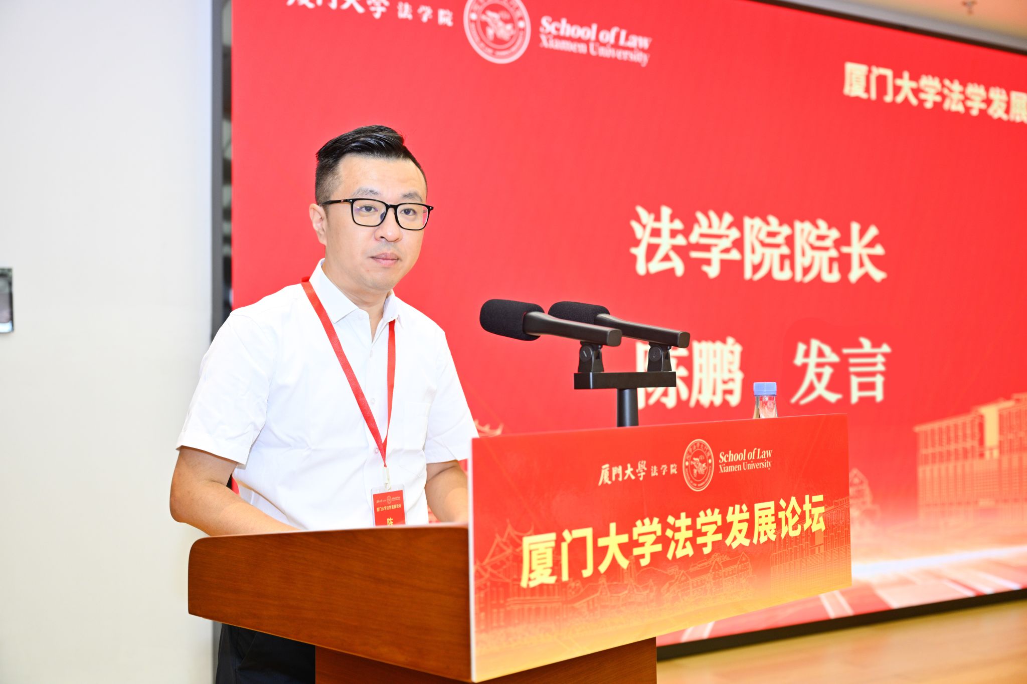 陈鹏在发言中指出,厦门大学法学学科的每一步成长,都离不开历代法学人的坚守,更离不开各位校友的鼎力支持。他表示,在新落成的黄毅楼里举办法学发展论坛,既是对百年历程深切致敬的预热,更是对未来一年的战略谋划与全面动员。他热切地期盼各位校友凝心聚力,成为学科发展的“智囊团”、育人事业的“同行人”、厦法精神的“传播者”,携手谋划新百年的发展蓝图。