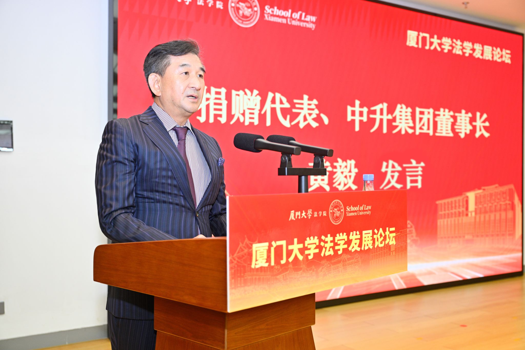 黄毅在发言中表示,厦大校友是他一生引以为荣的身份,捐赠新大楼源于对母校的感恩之情,源于对法治的信仰之诚,更源于对国家民族的热爱之心。厦大法学学科已走过99年光荣历史,为中国法治建设培养了大批高素质法律人才,为中国法学研究贡献了众多重要成果。他为大楼的建成感到欣慰与自豪,希望大楼能够见证法学院迎接新时代挑战、抓住新发展机遇,迎来新百年辉煌。