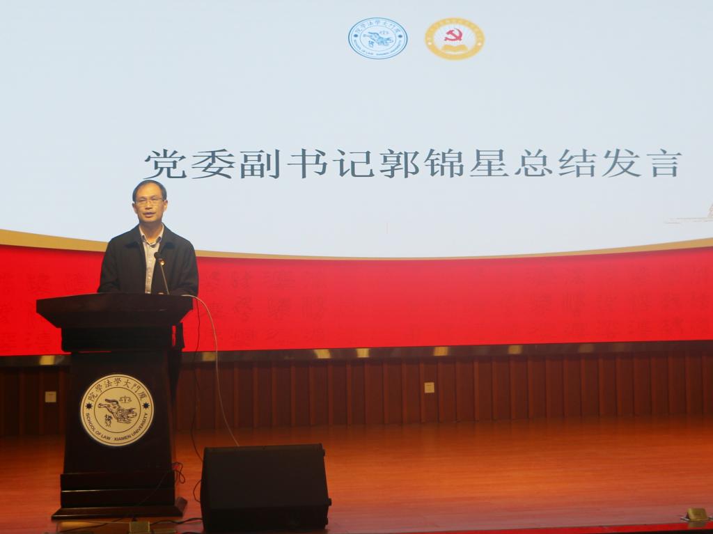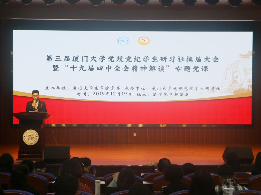 2019年12月19日下午,厦门大学第三届党规党纪学生研习社换届大会暨“十九届四中全会精神解读”专题党课在法学院模拟法庭成功举行。厦门大学法学院党委副书记郭锦星,集美大学法学院副教授郑贤宇,厦门大学法学院团委副书记、研习社社团指导老师杨璐及研习社骨干成员、法学院全体研究生党员出席了本次会议。本次会议由第二届厦门大学党规党纪学生研习社宣传部部长杨艺荣主持。