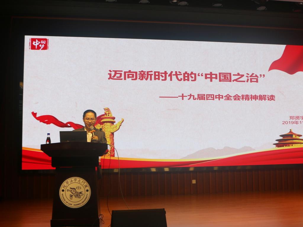 换届大会结束后,集美大学法学院副教授郑贤宇老师为法学院全体研究生党员带来“不忘初心、牢记使命”主题教育之《迈向新时代的“中国之治”——十九届四中全会精神解读》的专题讲座。郑贤宇老师从逻辑结构、背景分析、主要内容三个方面透彻解读了《中共中央关于坚持和完善中国特色社会主义制度推进国家治理体系和治理能力现代化若干重大问题的决定》,从中国特色社会主义法治体系、基本经济制度、先进文化制度、民生保障制度、社会治理制度、国防军事制度、“一国两制”制度体系、大国外交政策、国家监督体系等方面让党员们进一步深入领会坚持和完善新时代中国特色社会主义制度、推进国家治理体系和治理能力现代化的内涵及重要意义,大大提升了研究生党员的素质。