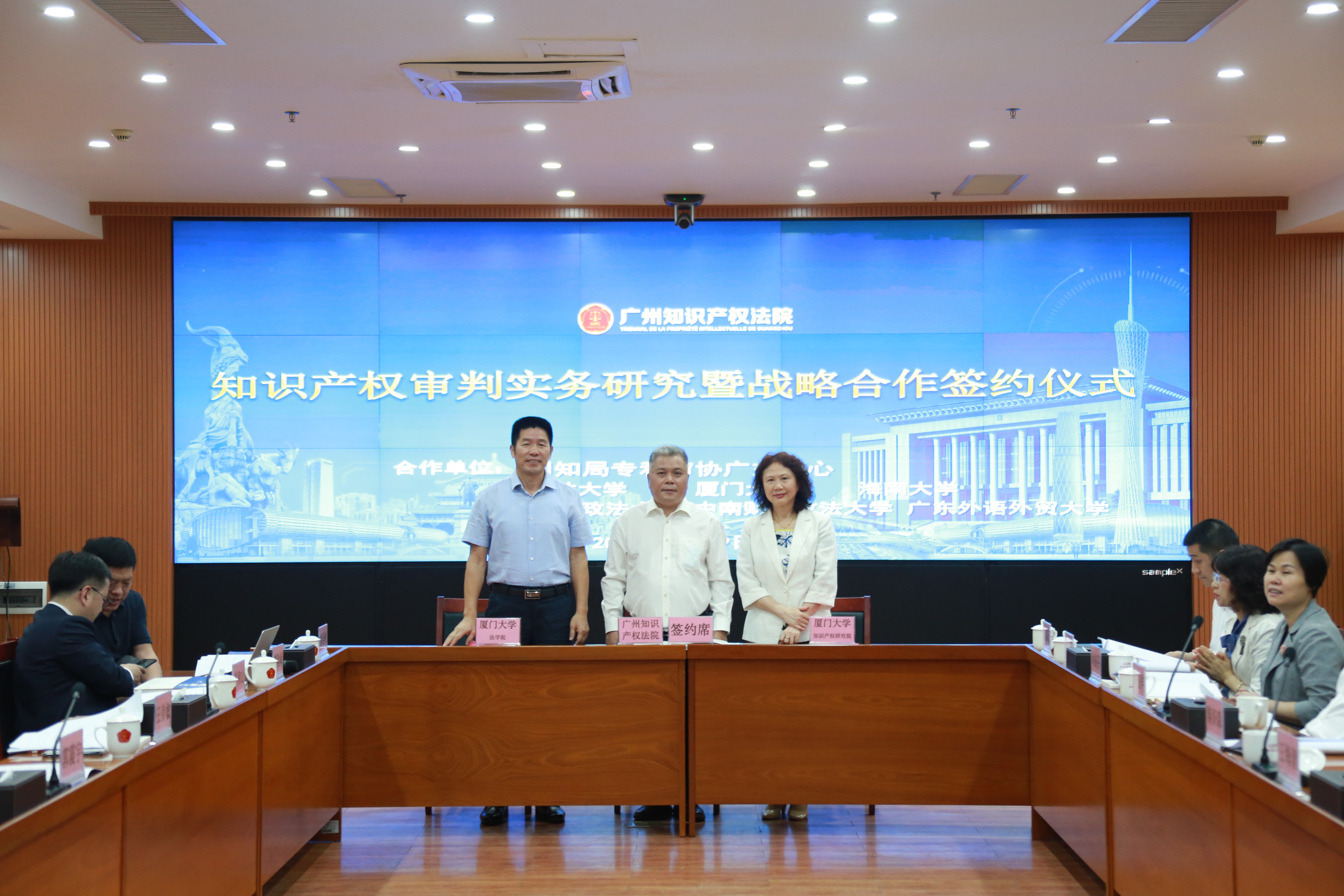 2021年4月19日上午,厦门大学法学院党委书记许和山、知识产权研究院院长林秀芹共同出席了广州知识产权法院举办的“知识产权审判实务研究暨战略合作签约仪式”。广州知识产权法院是全国首批三家知识产权专门法院之一,其审结的“魔兽世界”案、高通公司诉苹果公司案等一批大案要案先后被评为全国、全省知识产权重大典型案例;同时其也在跨区域知识产权远程诉讼、适用惩罚性赔偿等方面先行先试,为全国法院提供了“创新样板”、贡献了“广知经验”。