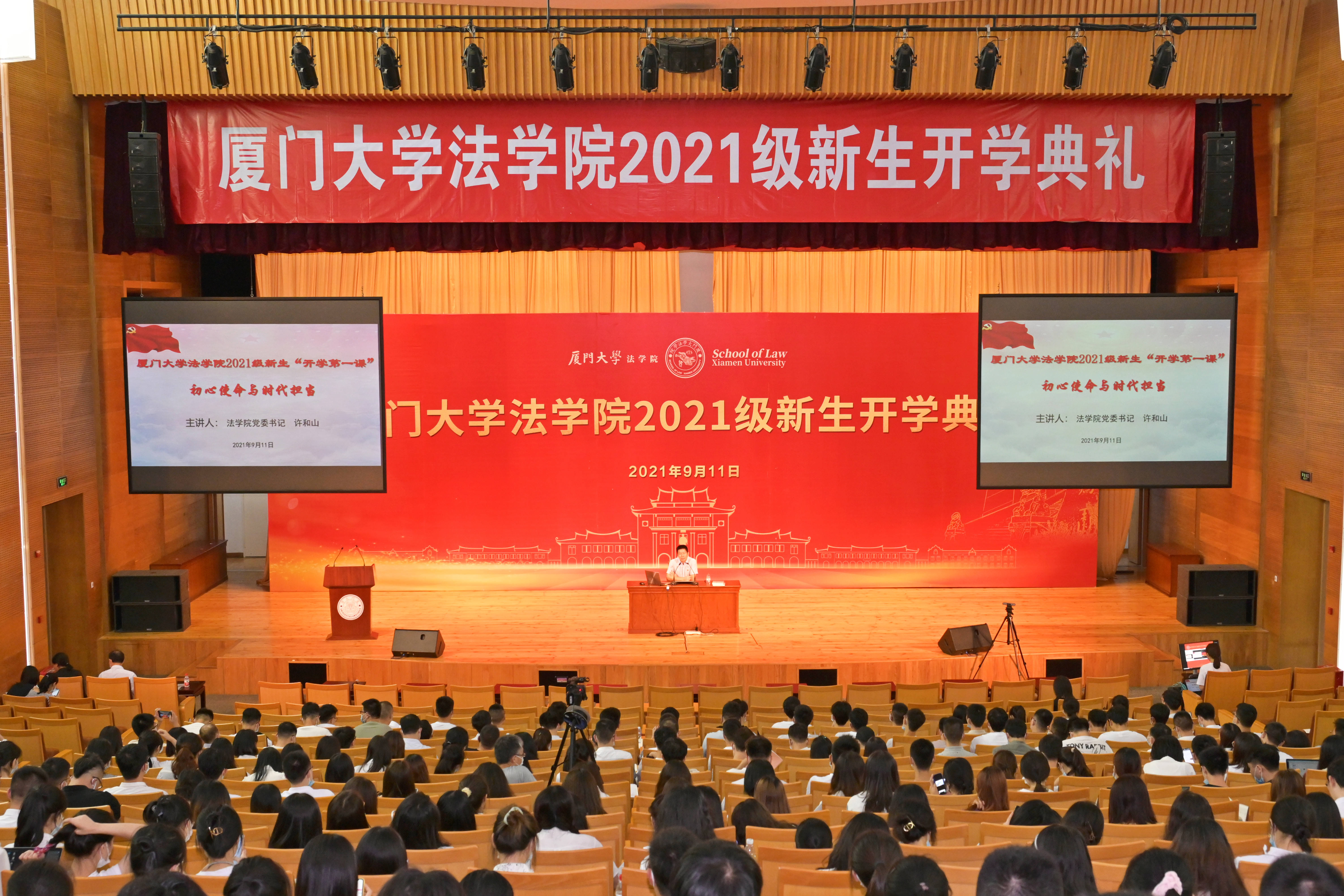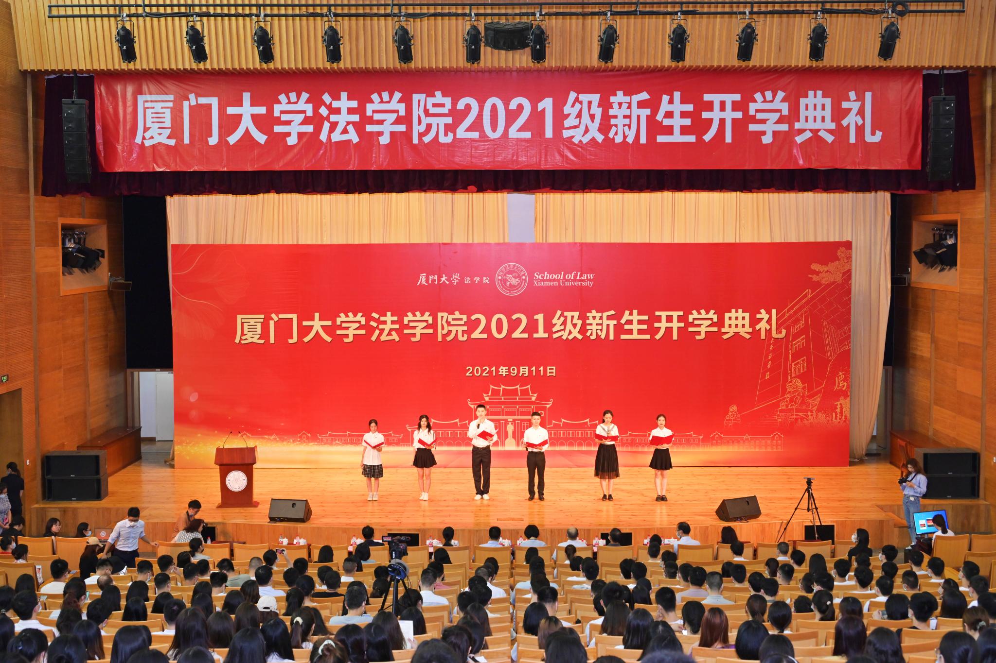 9月11日上午,厦门大学法学院2021级新生开学典礼于科学艺术中心报告厅隆重举行。法学院1993级院友陈昱,法学院党委书记许和山,院长宋方青,学院党政领导及各教研室主任、班主任,各教工党支部书记,行政秘书、辅导员出席典礼,学院全体2021级本科生、研究生新生参加典礼。本次典礼由法学院党委副书记张伟主持。