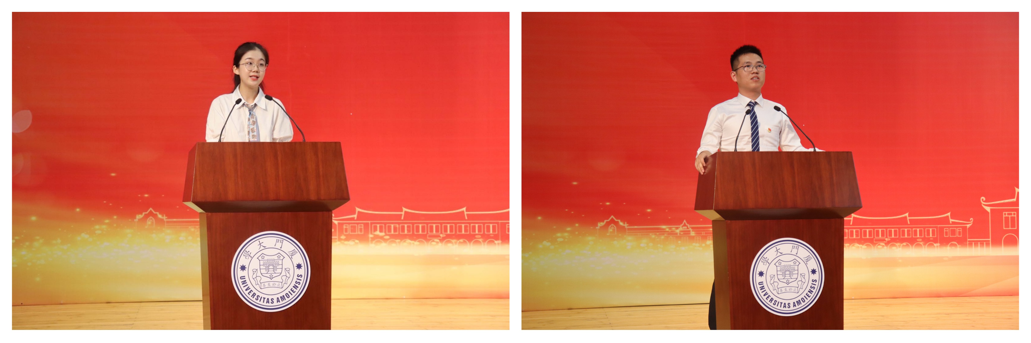 随后,2018级本科生范潇、2021级知识产权管理学博士生刘建军分别代表老生、新生上台发言。范潇回顾了她的大学前三年,鼓励大家格物致知、悦纳自我、开拓视野、胸怀天下,从而更好地规划大学时光,找寻心中的期许与热爱。刘建军既是厦大新百年的第一届毕业生,也是厦大新百年迎来的第一届新生。面对新起点,他以热情洋溢的语言与大家共勉,祝愿大家能够领略更多厦园风物,探索无央世界,秉承校训之信念,高歌远志,砥砺前行。