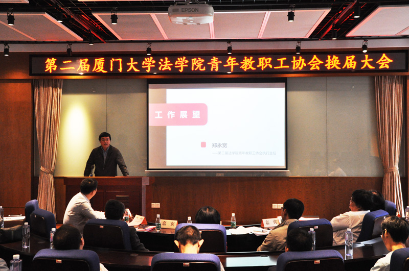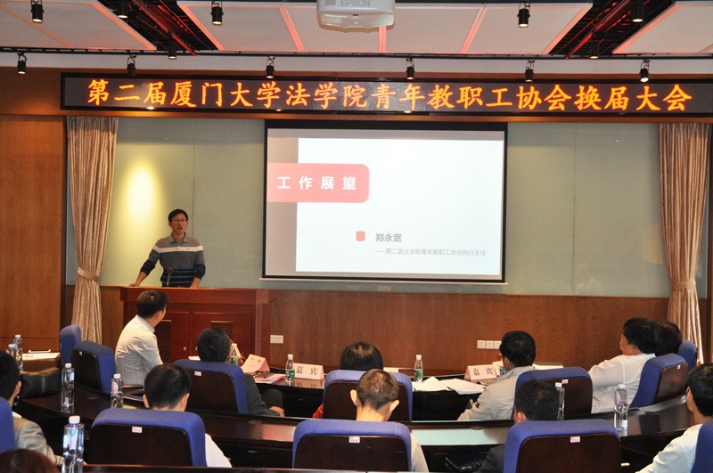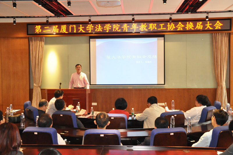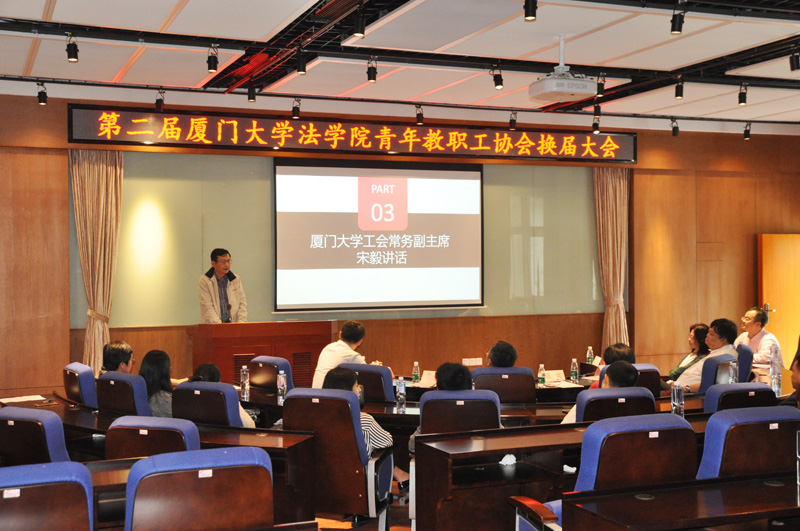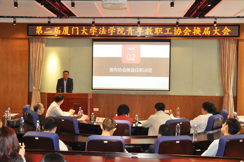 2017年4月15日下午,厦门大学法学院青年教职工协会在B138会议室举办换届大会。厦门大学工会常务副主席宋毅、法学院院长宋方青、党委书记李智勇、党委副书记周蕾、副院长何丽新、法学院工会主席周东平、学院四十周岁以下青年教职工参加会议。会议由法学院团委书记高斌主持。