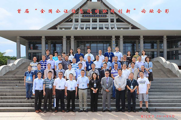 2016年6月7日,首届“全国公证信息化的协同创新”论坛在厦门大学科学艺术中心隆重举行。本次论坛以“公证信息化的战略框架构建”为主题,由福建省公证协会、厦门大学公证法律与信息化研究中心联合主办。中国公证协会常务理事、北京市长安公证处主任周志扬,甘肃省公证协会副秘书长张文研,中国公证协会信息化建设委员会主任委员、厦门市鹭江公证处主任苏国强,厦门法信公证云科技有限公司总经理陈艳,厦门大学自动化系教授吴顺祥,以及来自上海、江苏、吉林、广东、山东、重庆、云南、福建、香港等省市地区公证机构及相关单位代表共计70余人参会。