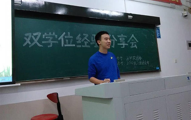 12月2日19时,2014级2班双学位经验分享会在法学院A201教室举行。由于大一同学对于双学位制度充满了一系列的好奇与疑惑,为积极响应团委要求以及满足大一同学的需求,大二二班特举办此次双学位经验分享活动,借由邀请大二二班嘉宾分享经验,旨在为大一同学们答疑解惑,帮助大一同学们更加了解双学位学习的状况,进而做出适合自己的学习生活规划以及职业规划。