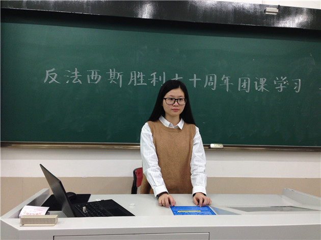 在团课的一开始,团支书林卉卉发表了讲话。她指出,在反法西斯战争中,中华热血儿女毅然奔赴抗日前线,加入救亡图存的行列,他们为求得民族的解放,抛头颅、洒热血,在枪林弹雨中写就了他们壮丽的人生篇章。中国人民浴血奋战所铸就的前仆后继、不屈不挠、团结奋斗、反抗侵略的抗战精神是一种伟大民族精神,是一种具有中国特色的爱国主义精神,是今天我们这个时代最珍贵的精神财富。