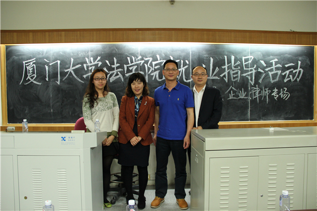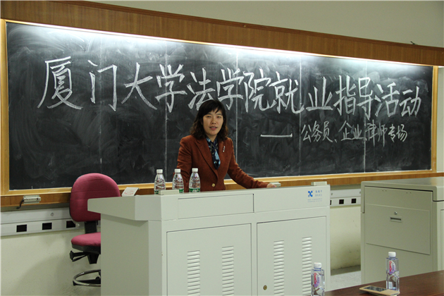 4月15日晚上7点,厦门大学法学院就业指导系列活动之公务员、律师、企业专场在法学院B138教室如期举行。本场讲座的嘉宾是由我院毕业的三位职场达人——上海锦天城(厦门)律师事务所合伙人章水仙、厦门恒兴集团有限公司法务部总经理黄如辉以及厦门市委编办体制改革处副处长罗雪光。法学院团委书记高斌以及辅导员宋磊华也出席了本场讲座。