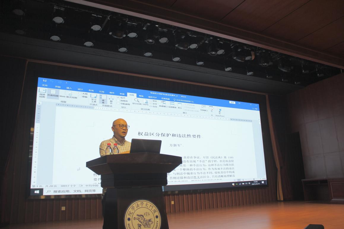 2021年5月14日晚7点,厦门大学法学院师生期待已久的,主题为《权益区分保护和违法性要件》讲座在法学院模拟法庭如期举行。本次讲座有幸请到了苏州大学王健法学院院长、博士生导师、江苏省法学会副会长、中国民法学研究会常务理事方新军教授作为主讲嘉宾,厦门大学法学院郑永宽教授担任本次讲座主持人。现场参加人员还包括厦门大学法学院徐国栋教授、何丽新教授、郑晓剑副院长、齐云助理教授,此外还有不少慕名而来的校友,以及研究生、本科生出席聆听,求知氛围浓厚,现场气氛甚佳。