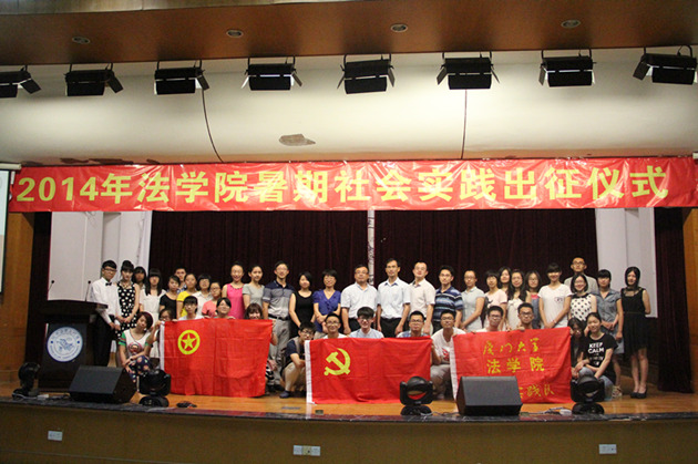 2014年7月1日晚七点,我院暑期社会实践出征仪式在模拟法庭举行,今年我院共有30支暑期社会实践队伍,各实践队的队员都来到出征仪式现场。我院党委书记李智勇,党委副书记周蕾、郭锦星,团委书记高斌,辅导员林旭荣、宋磊华,指导教师代表吴旭阳以及重宇合众律师事务所的律师代表出席了本次活动。