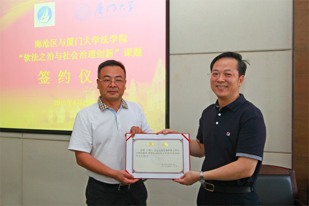 会上,我院李智勇书记、海沧区纪工委江根云书记分别致辞。接着由厦门大学社会治理与软法研究中心执行主任宋方青教授与海沧区民政局颜忠进局长进行课题签约,并举行了敦聘海沧区纪委江根云书记和为厦门大学法学院兼职硕士研究生导师、敦聘海沧区综治办刘怀书主任和区司法局孔幸安局长为厦门大学社会治理与软法研究中心兼职研究员的仪式,以及“法学教育实践基地”授牌仪式。