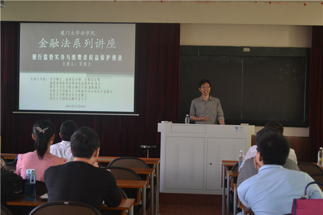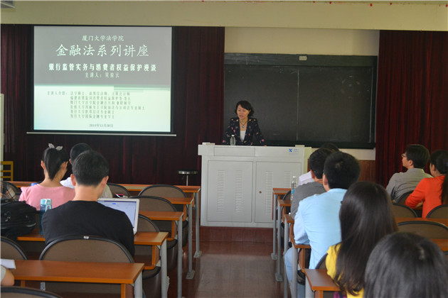 2014年11月30日上午9:30在法学院A302教室举办的《银行监管实务与消费者权益保护漫谈》 是在我院金融法方向硕士班开办之后的第一场讲座,讲座有幸邀请到福建省银监局消费者权益保护处处长、我院金融法方向兼职硕导吴育云老师。我院经济法教研室刘志云教授主持了本场讲座。