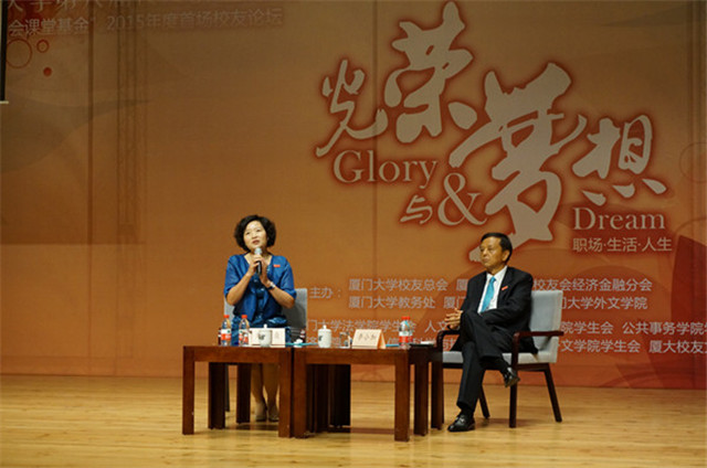 论坛即将结束之时,厦门大学副校长、校友总会副秘书长詹心丽向两位嘉宾赠送纪念品,此次厦门大学第六届校友创业论坛“光荣与梦想”圆满落幕。