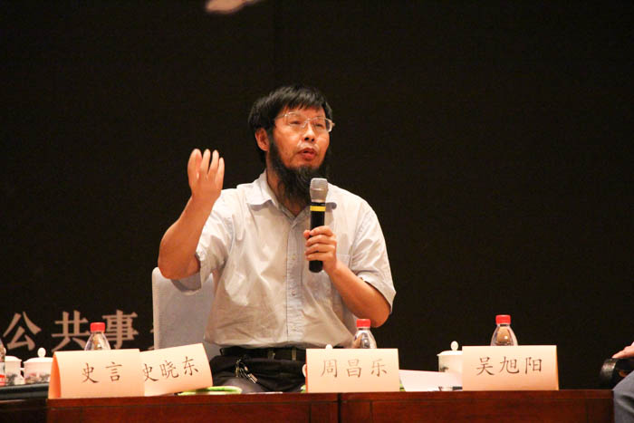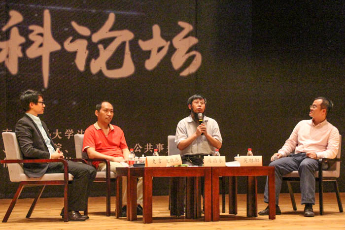 接着,本届跨学科论坛第一场的嘉宾中文系助理教授史言老师、法学院助理教授吴旭阳老师、信息科学与技术学院教授史晓东老师以及嘉宾主持人信息科学与技术学院教授周昌乐老师依次入座,一场关于人工智能的交流讨论正式开始。