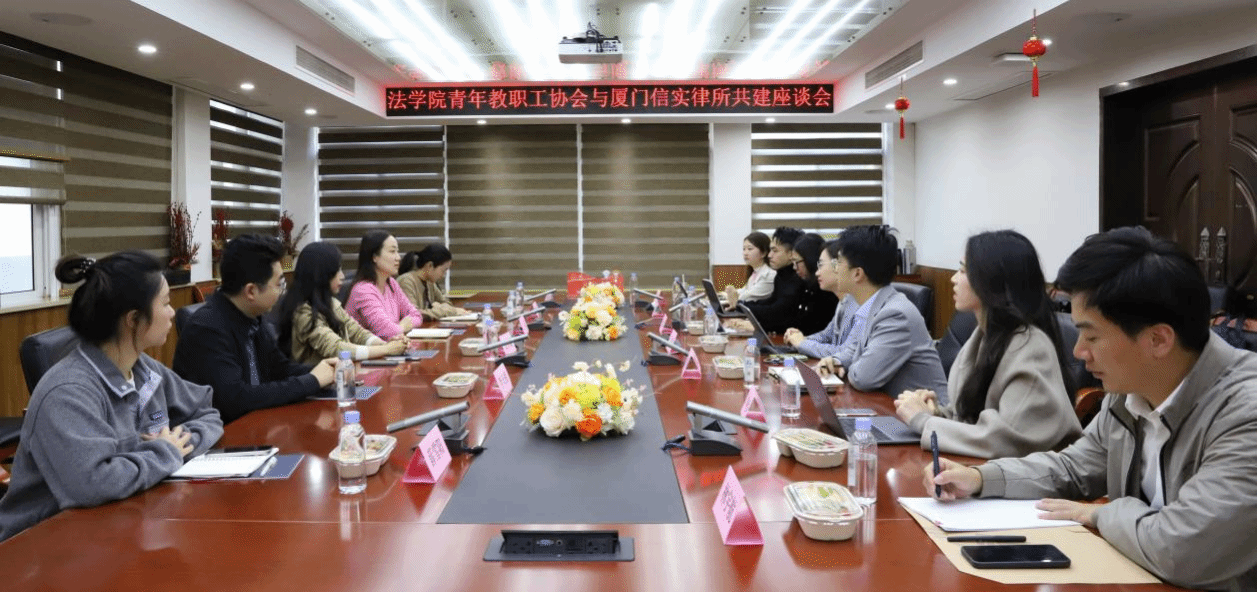 为了进一步深化厦门大学法学院与福建信实律师事务所的共建纽带,2025年12月16日下午,厦门大学法学院青年教职工协会(以下简称“青椒会”)与福建信实律师事务所青年律师工作委员会(以下简称“青工委”)的交流座谈会在法学院C220会议室顺利举办。