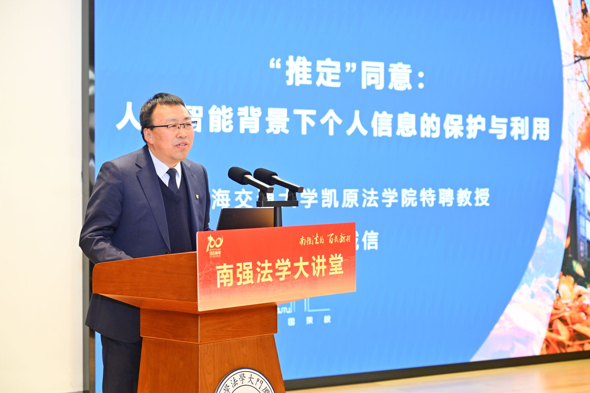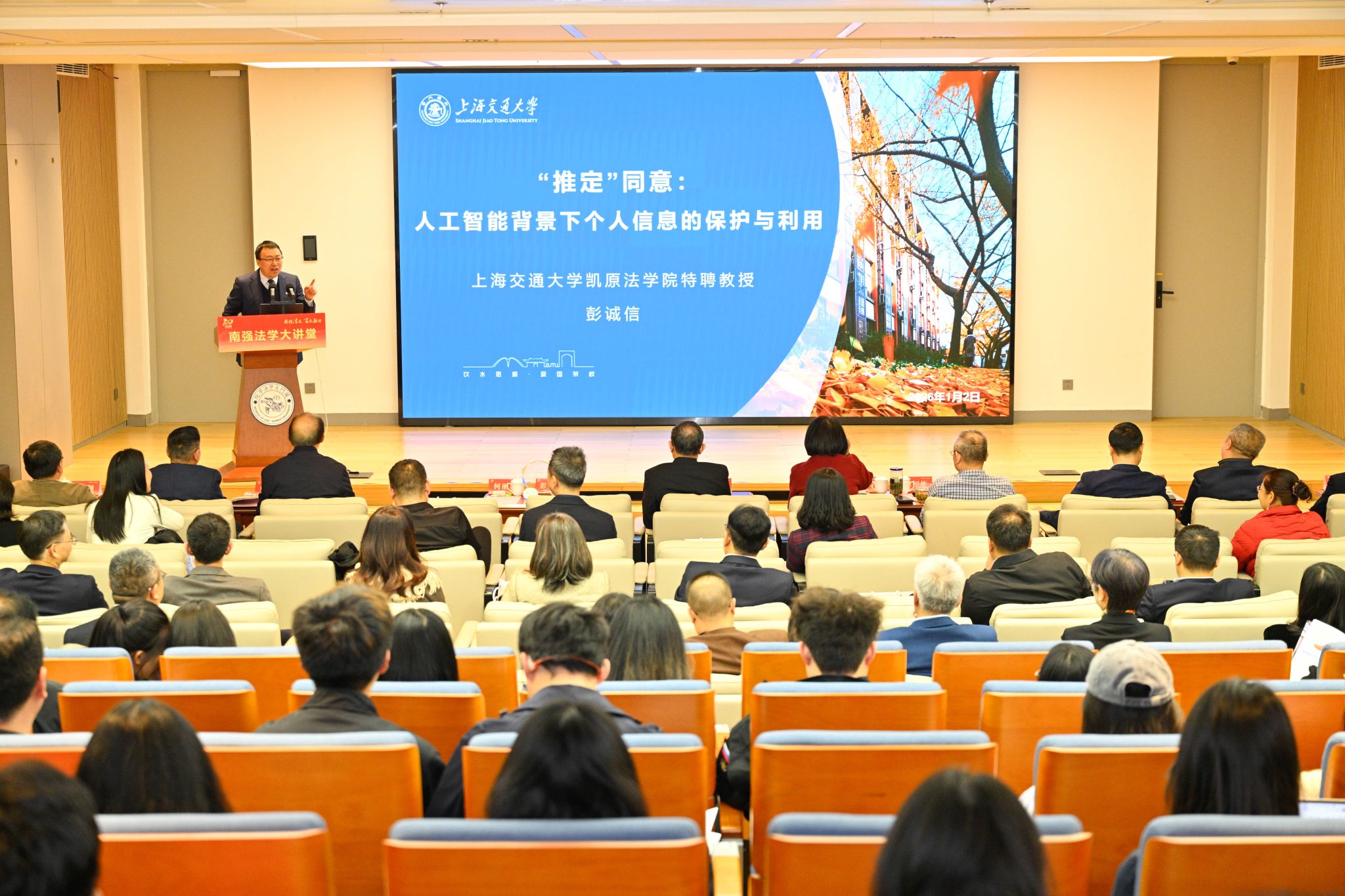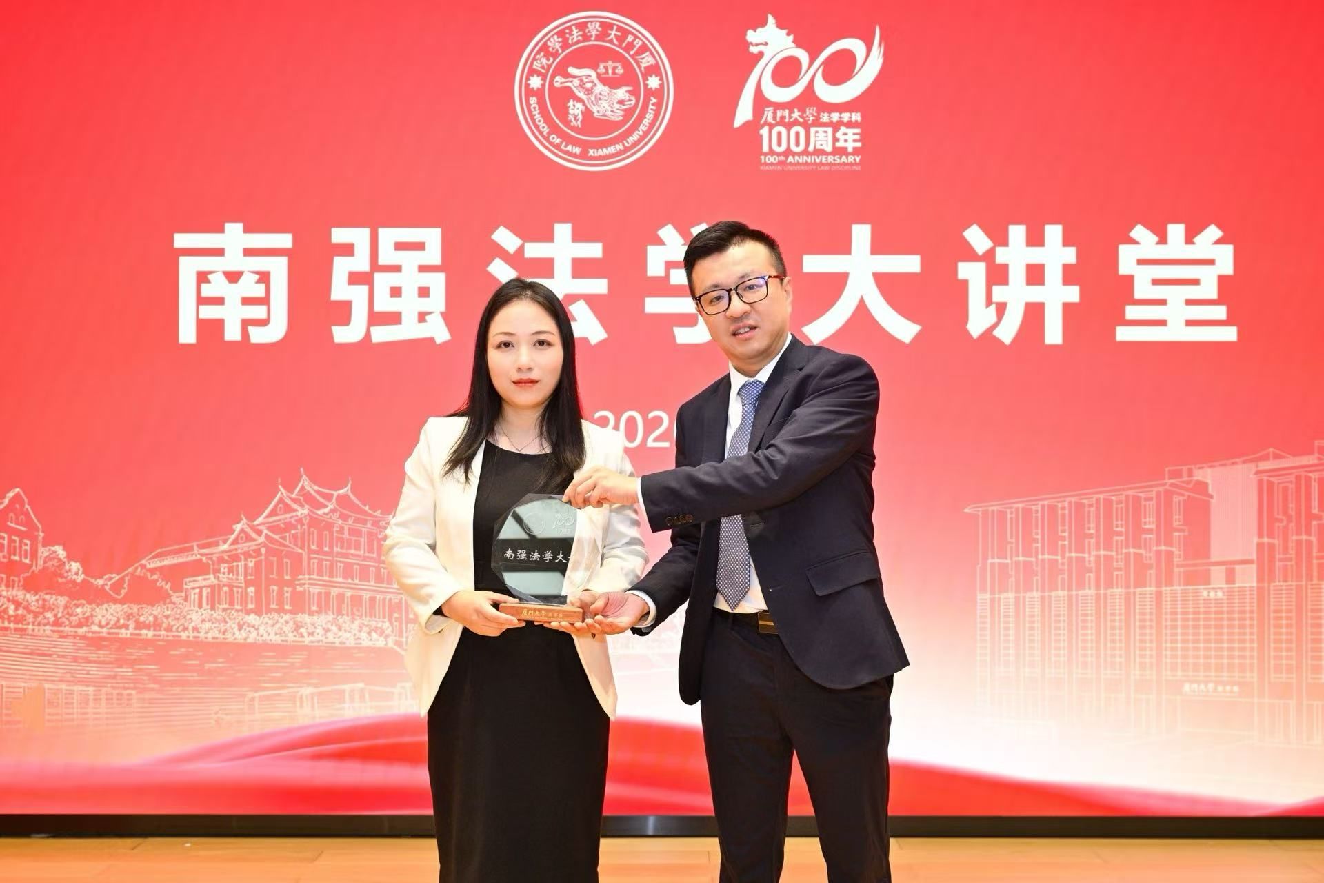 第一讲主题为“人工智能时代的法治”,特邀嘉宾为上海交通大学特聘教授、博士生导师、凯原法学院院长彭诚信,和厦门大学知识产权研究院教授、博士生导师董慧娟。开始前,院长陈鹏教授为两位嘉宾颁发“南强法学大讲堂”纪念牌。