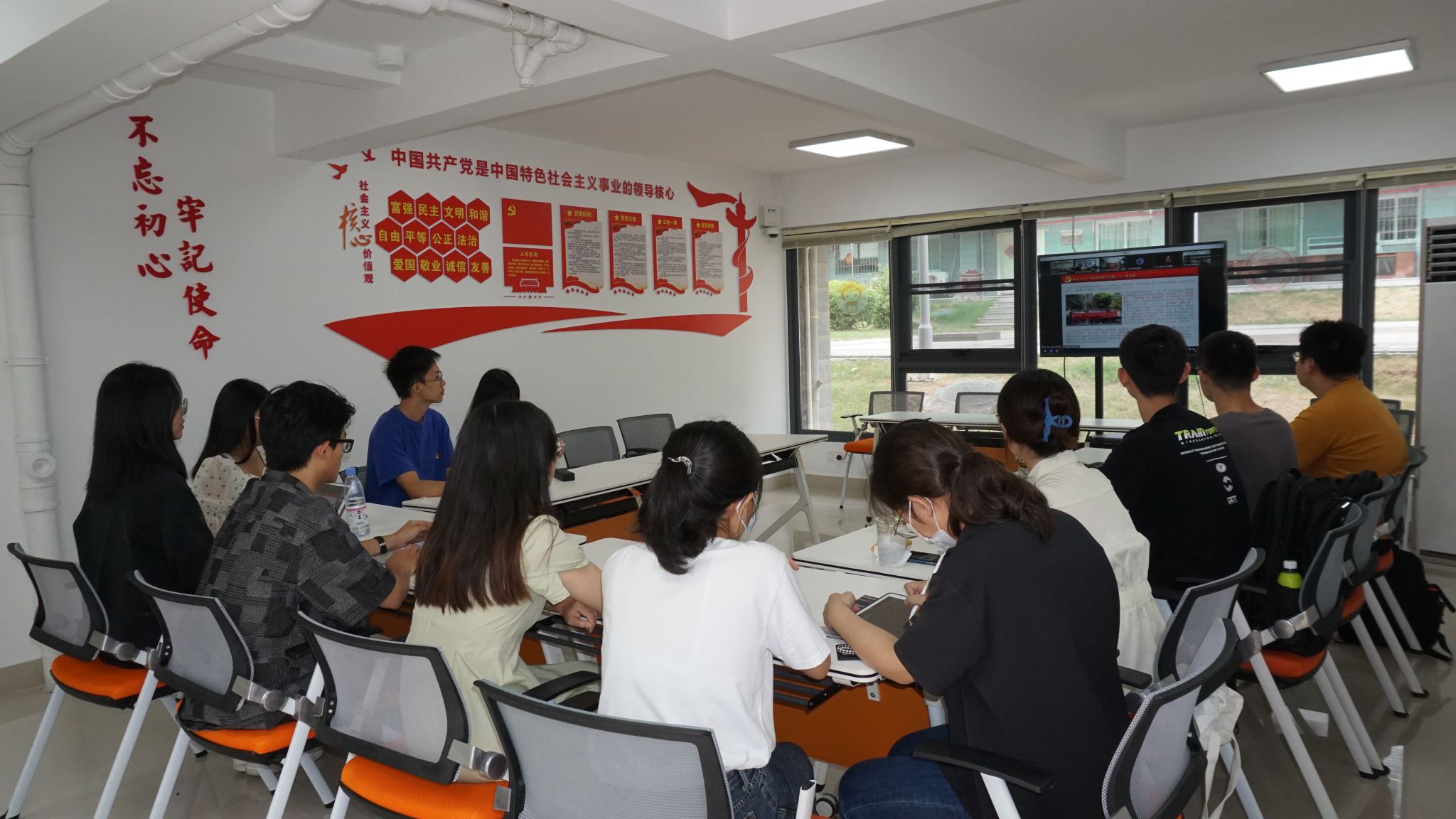 厦门大学党规党纪学生研习社党支部、法学院2021级法律硕士生第一党支部的支部成员代表在厦门大学学习共享空间海韵9党团活动室集中参与此次线上研讨联学活动。