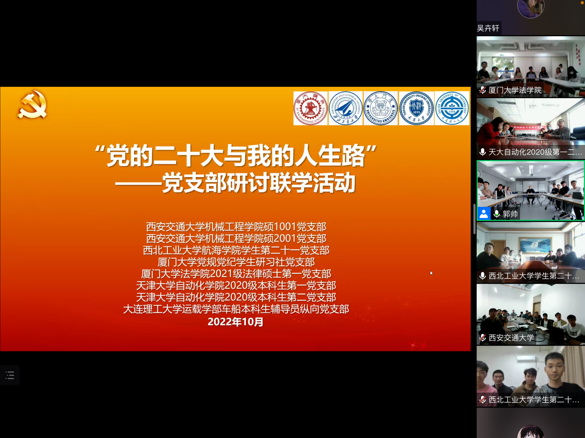 10月23日下午,厦门大学党规党纪学生研习社党支部、法学院2021级法律硕士生第一党支部与西安交通大学机械工程学院硕1001党支部、西安交通大学机械工程学院硕2001党支部、西北工业大学航海学院学生第二十一党支部、天津大学自动化学院2020级本科生第一党支部、天津大学自动化学院2020级本科生第二党支部、大连理工大学运载学部车船本科生辅导员纵向党支部等兄弟学校党支部共同开展“党的二十大与我的人生路”研讨联学活动。