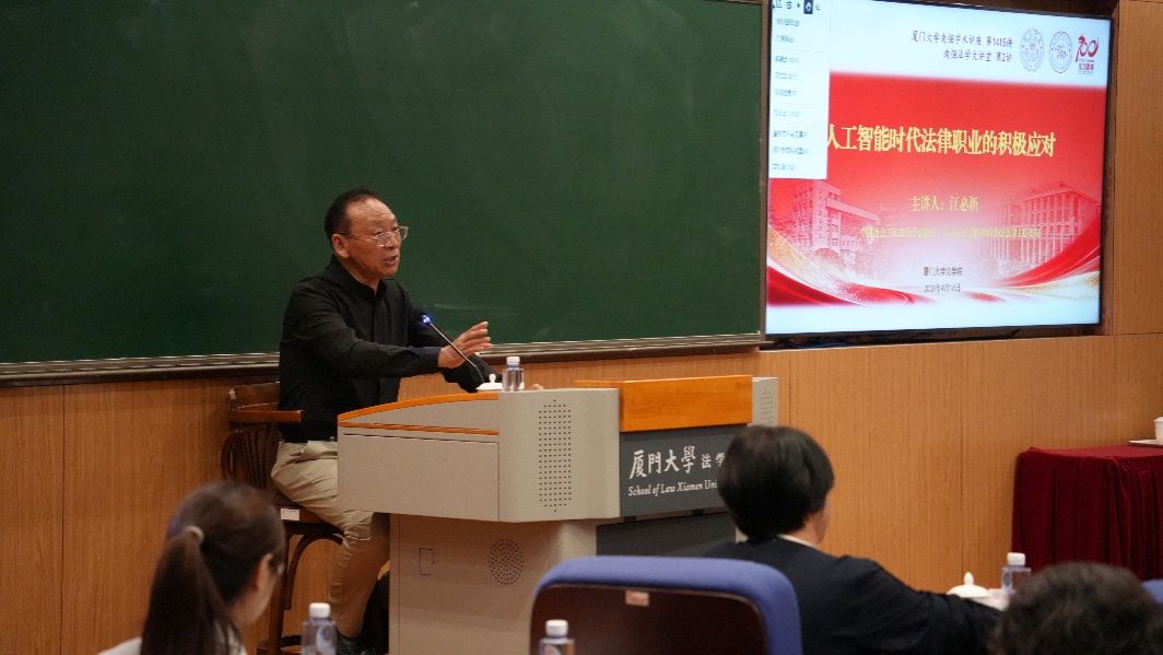 2026年4月16日晚,南强学术讲座第1415讲暨南强法学大讲堂第2讲在法学院B138报告厅举行。本次讲座特别邀请中国社会工作联合会副会长、最高人民法院咨询委员会副主任委员江必新教授主讲。江必新教授以“人工智能时代法律职业的积极应对”为题,为在场师生打开了观察法律行业变革的全新视角。厦门大学党委常务副书记林东伟出席本次讲座,法学院党委书记何丽新教授主持,院长陈鹏教授为讲座致辞。