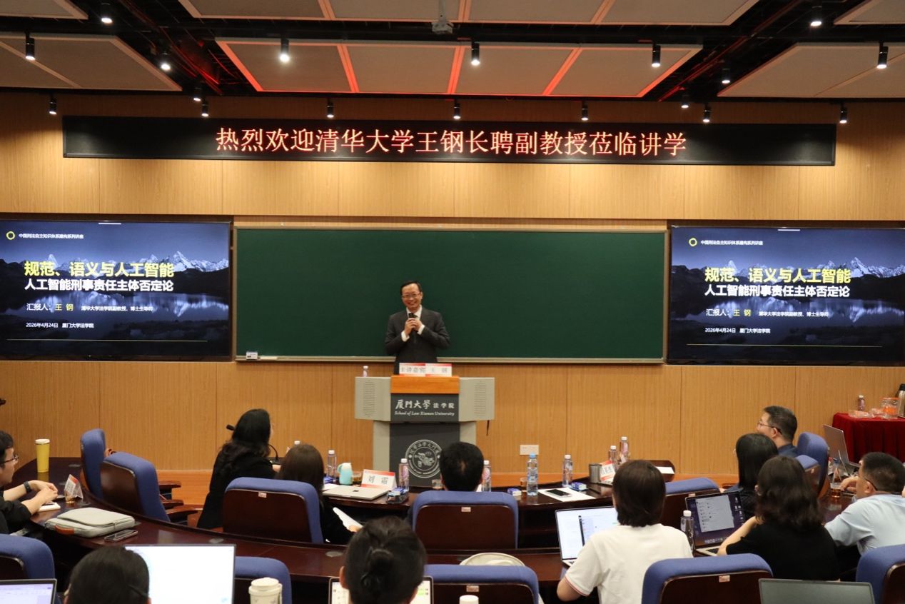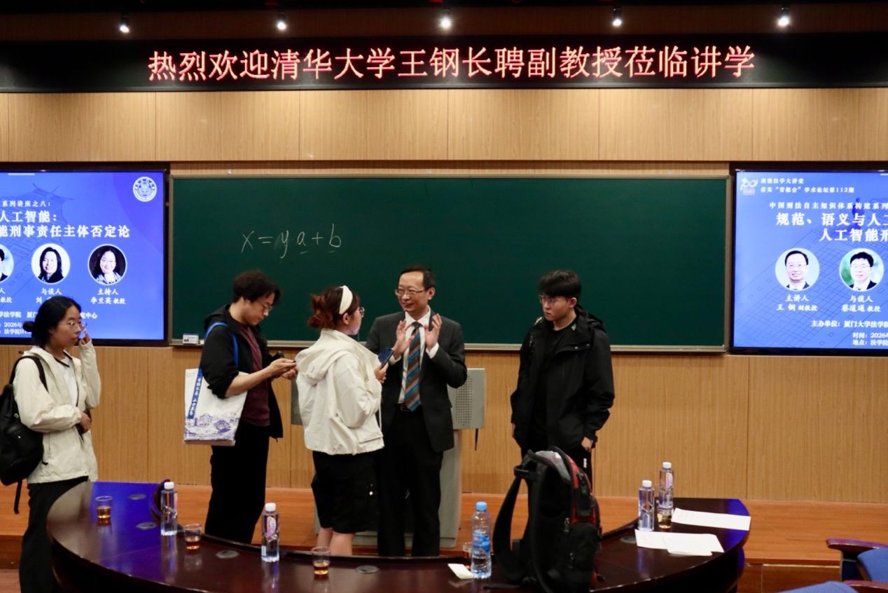 鹭岛春风,刑思畅达。4月24日,在厦门大学法学院B138报告厅,清华大学法学院长聘副教授、博士生导师王钢带来一场题为“规范、语义与人工智能:人工智能刑事责任主体否定论”的学术讲座。本次讲座系信实“青椒会”学术论坛第112期暨“中国刑法自主知识体系构建”系列讲座之八。厦门大学法学院刑法学科带头人李兰英教授主持本次讲座,南京师范大学法学院蔡道通教授、天津大学法学院刘霜教授,以及刑法教研室的吕英杰老师、李晓龙老师共同参与探讨了人工智能时代刑事归责的重大前沿议题。