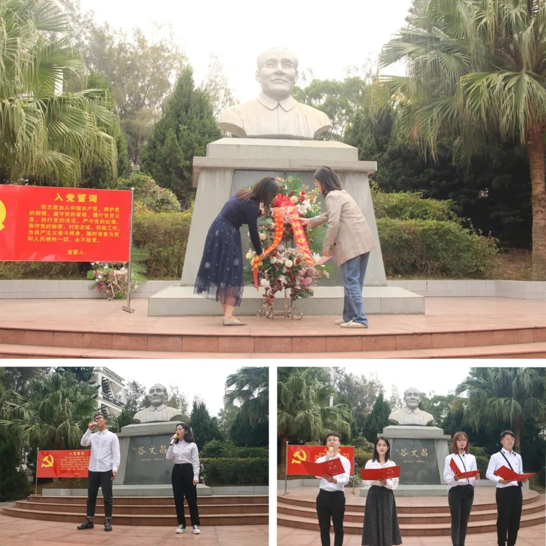 参访过后,同学们前往谷文昌陵园。带队老师周晓牧、吴维向谷文昌同志塑像敬献花篮,学生党员刘通成、范双全、朱源宇、韩佳牧朗诵原创纪念诗词《谷书记,您从未离开过》,学生党员杨凯希、黄伟佳演唱歌曲《不忘初心》,以表对谷公的敬仰与追思。而后,党员们在谷文昌同志塑像前重温入党誓词。