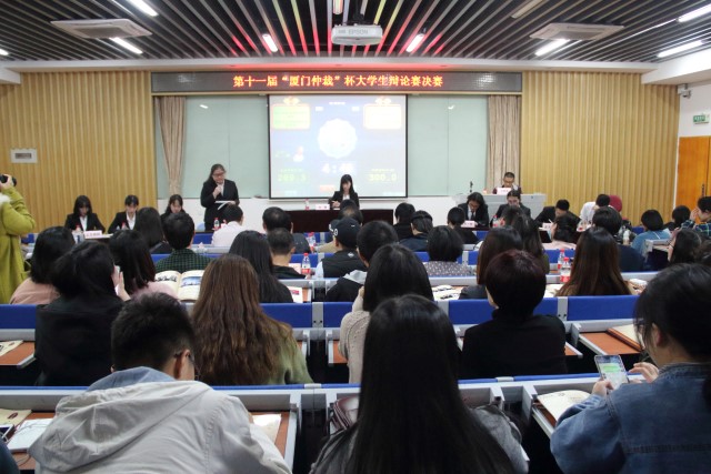 经过校内预选赛、初赛、复赛、半决赛连续四周的激烈角逐,2017年12月9日晚7点,第十一届“厦门仲裁杯”大学生辩论赛决赛暨颁奖仪式在法学院B137举行。两强相争,巅峰相对,正方厦门大学嘉庚学院代表队与反方厦门大学代表队B队就辩题“建设文化强国重在发扬传统”与“建设文化强国重在融入世界”展开冠军争夺。