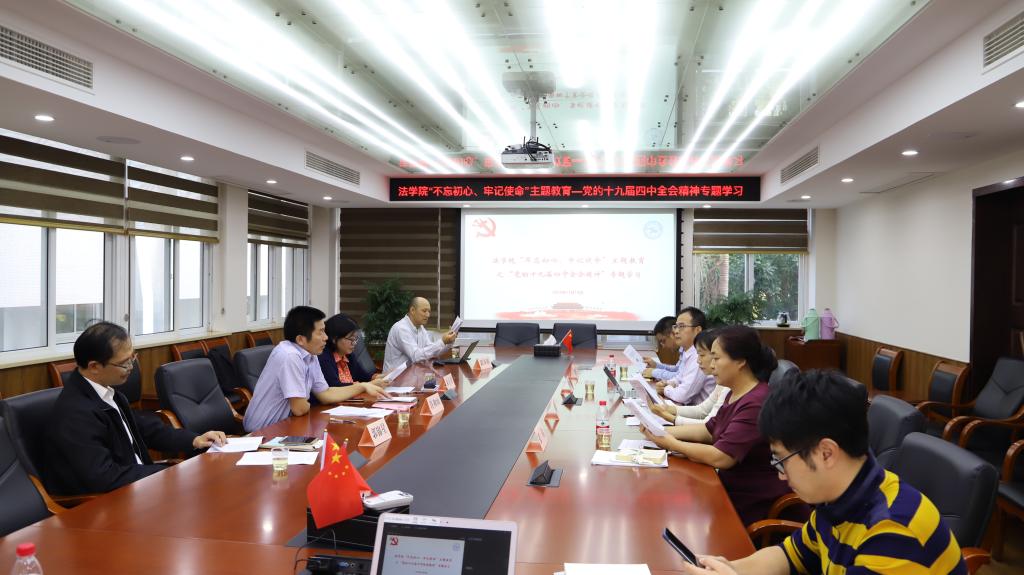 11月14日下午,法学院党委在B220会议室组织召开了“党的十九届四中全会精神”专题学习会议,法学院党政领导班子全体成员出席了本次会议。