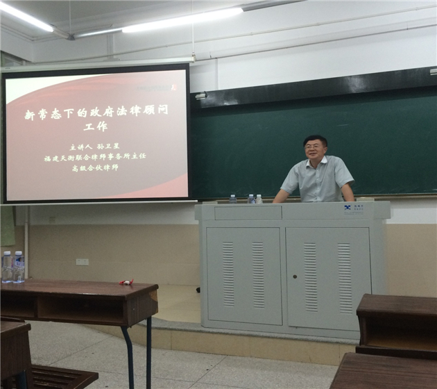 2015年5月20日晚七点,福建天衡联合律师事务所高级合伙人、中华全国律协多届理事、全国律师协会民事委员会副主任、福建省律协副会长、厦门市律师协会副会长、中国人民大学律师学院兼职教授孙卫星主任莅临厦门大学法学院,以“新常态下的政府法律顾问服务”为题在法学院A203举行了一场别开生面的讲座。孙主任在政府法律服务领域工作数十年,经验丰富,就政府法律顾问服务的方方面面为在座缺乏实务经验的法律硕士研究生带来了一场精彩纷呈的讲座。讲座围绕“新常态下的政府法律顾问服务”这一核心问题,从以下五个重点展开:一、当前律师担任政府法律顾问的简况、现状和发展趋势;二、律师担任政府法律顾问的途径;三、律师担任政府法律顾问的优势及工作定位;四、称职的政府法律顾问应具备的素质和条件;五、提点做好政府法律顾问工作的注意事项。
