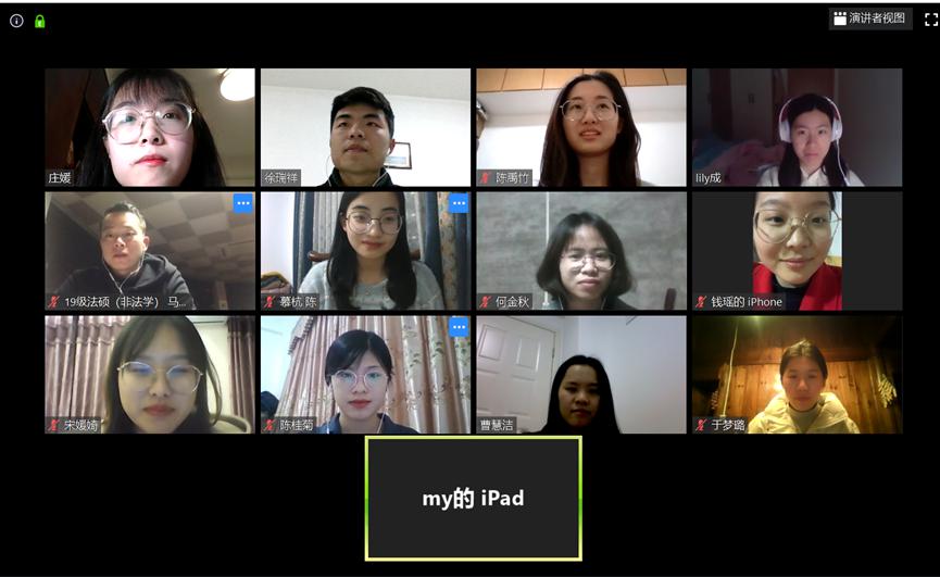 为深入学习贯彻习近平总书记有关新冠肺炎疫情防控工作的重要讲话精神,进一步激发研究生党员的责任担当意识,在研究生党员中厚植爱国主义,号召党员们主动出列、接受考验,为坚决打赢疫情防控的人民战争、总体战、阻击战贡献青春力量。在法学院团委的指导下,2020年3月11日晚,厦门大学党规党纪学生研习社团支部利用线上平台开展了廌园先锋理论学习会暨“疫情下的厦大青年说”主题微团课,内容主要围绕“疫情期间如何更好地发挥党员先锋模范作用”展开,会议由社团支部书记、社长徐瑞祥主持。