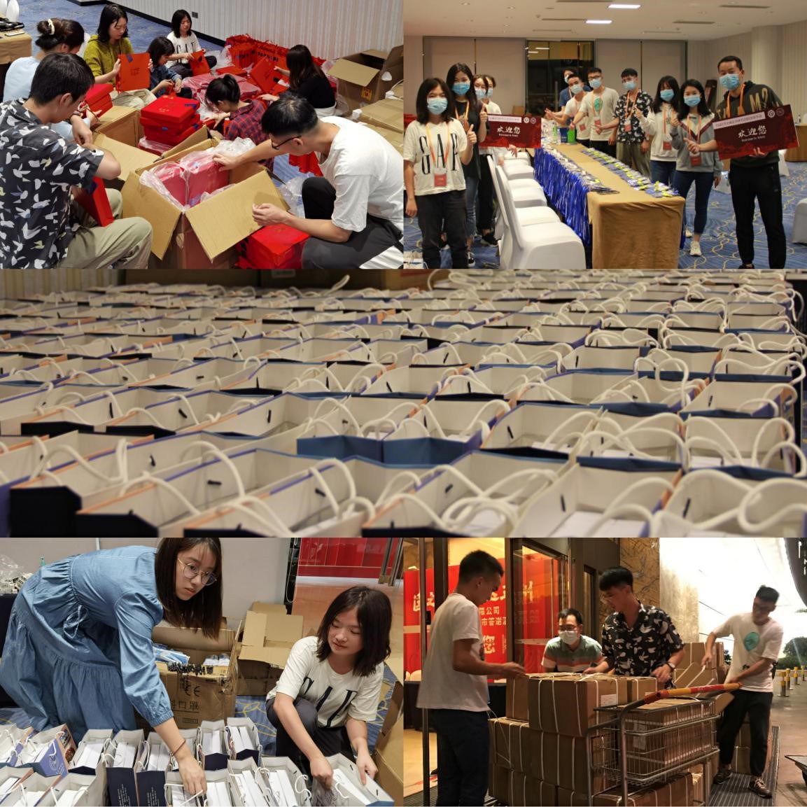 会务组志愿者承担了全会物资的整备工作。为了保障与会嘉宾有最好的参会体验,会务组决定采用“专人专证”的方式打印参会证。时间紧、任务重,志愿者们创新高效工作方式方法,是年会报到工作高效、顺畅开展的基础。最终的物资装袋,在疫情防控人员有限的不利条件下,志愿者们从白天战斗至黑夜,忘记了饥渴,忘记了疲惫,发挥革命乐观精神,齐心协力,终于完成了五百多份嘉宾材料的整备工作。