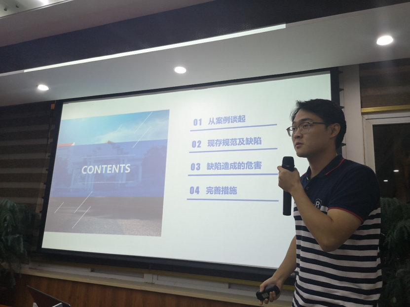 第四位展示的是姚宇涵同学,他主要介绍律师事务所的勤勉尽责问题。首先,通过案例以及现有规范分析,他详细说明了证监会行政处罚中有待商榷的问题,比如实践中存在律师事务所可能要对会计师事务所的审计报告与事实不符的部分承担责任的情形,并指出了对律师事务所的要求过高,法条适用单一等问题。其次,针对问题,他探讨了勤勉尽责的标准,即一般注意义务和专业注意义务的区别,强调了律师在财务报告等文件中的注意义务应与会计师等专业人员的注意义务相区分。最后,他认为律师事务所信息披露违法违规责任的认定应从三个层面进行完善:其一是立法层面,对于律师事务所的责任不能过重,且应当予以细化;其二是司法层面,法院对于勤勉尽责认定的裁判理由应当更加具体;其三是执法层面,证监会在执法过程中应当考虑具体情形,做出适当的决定。
