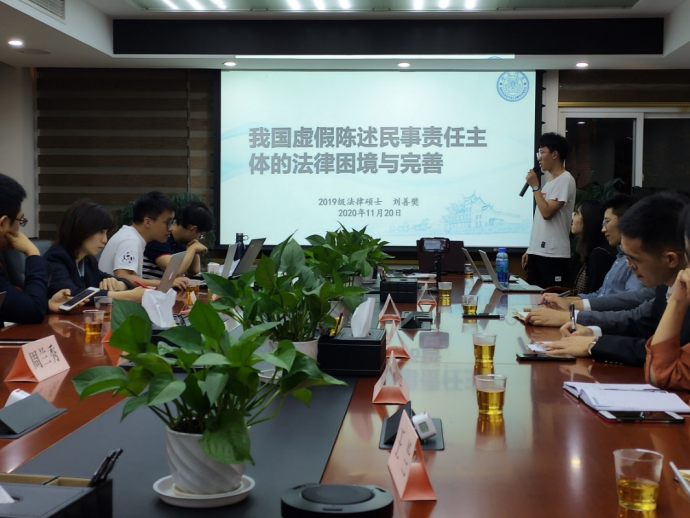 2020年11月21日晚,在法学院B220举办了21季第3期南强学术沙龙——“信息披露违法违规的法律责任”。本次学术沙龙邀请到了赵涛、曾振球、尤冰宁、张光辉、吴大希、张帆、陈弘、周兰秀、张伟昌、陈京等涵盖了证监局、法院、律所、公司等多个行业的法律实务界人士,以及厦门大学法学院的王兰和史欣媛老师作为特邀点评嘉宾,肖伟老师和陈榆同学作为本次学术沙龙的主持人。在肖老师的简短开场后,由2019级硕士研究生刘善樊、朱迪和陈榆,以及2020级硕士研究生朱倩茹、姚宇涵和洪松六位主讲人就“信息披露违法的违规法律责任”这一主题与大家分享交流了自己研究成果。