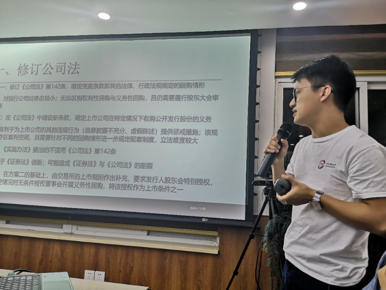 第六位展示的是洪松同学,评析了《欺诈发行上市股票责令回购实施办法(试行)》(征求意见稿)中的责令回购制度,这是发行阶段虚假信息披露的一项行政强制措施。他首先对责令回购制度进行了系统介绍,指出责令回购制度来源于新证券法第24条第二款,在世界范围内亦是首创。该制度部分地借鉴了香港洪良国际案中香港证监会的做法,通过要求欺诈发行的发行人及控股股东、实控人强制回购公开发行股票,以保护广大投资者。实施办法作为责令回购制度适用的具体指引,存在着与公司法第142条难以衔接、措施缺乏惩戒性、证监会自由裁量权过大等不足,并据此提出了相应的解决方案。