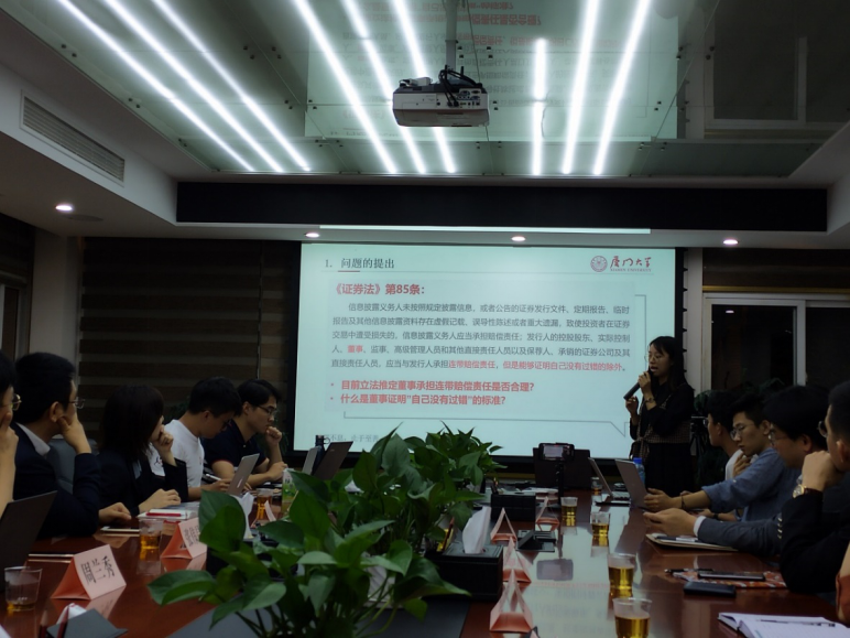 第一位展示的是朱倩茹同学,她主要围绕《证券法》第85条展开讨论,提出了两个问题:一是目前立法规定所有董事一律与发行人承担连带赔偿责任是否合理?二是董事证明“自己没有过错”的标准为何?她认为,实践中董事各自情况差异很大,在信息披露违法违规行为中作用不同,其主观恶性也是不同的,现行法律要求“董事”一律承担连带责任的规定过于笼统,应当区分董事的不同情况,细化勤勉尽责标准,将现行法律规定调整为:就虚假陈述产生的民事赔偿,董事应当承担补充赔偿责任,但是能够证明自己没有过错的除外;董事存在故意或重大过失的,应当承担连带赔偿责任。