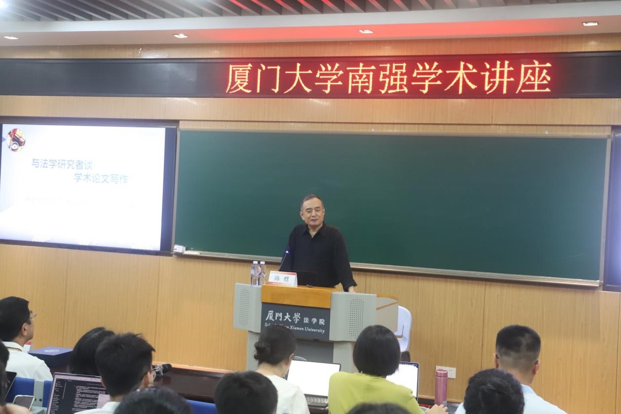 2024年10月14日晚,厦门大学南强学术讲座第1293讲在法学院B137报告厅举行。本次讲座特邀中国社会科学院学部委员、法学研究所一级研究员、中国法学会副会长、《法学研究》主编陈甦教授为主讲人,讲座主题为“与法学研究者谈学术论文写作”。