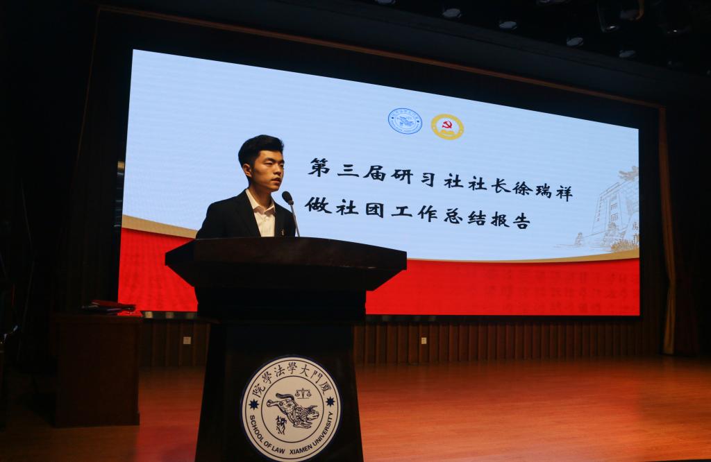 在庄严的国歌声中,换届大会拉开序幕。会议伊始,厦门大学党规党纪学生研习社第三届社长徐瑞祥对过去一年的社团工作进行总结报告。他从理论学习、支部建设、普法宣讲、对外交流及疫情防控等五个方面汇报了研习社上一年度的工作情况,指出了目前社团运行中存在的不足与改进的方向,期盼新一届研习社骨干和社员们努力凝聚青年学生党员力量,发出青年学生党员声音,彰显青年学生党员风采。