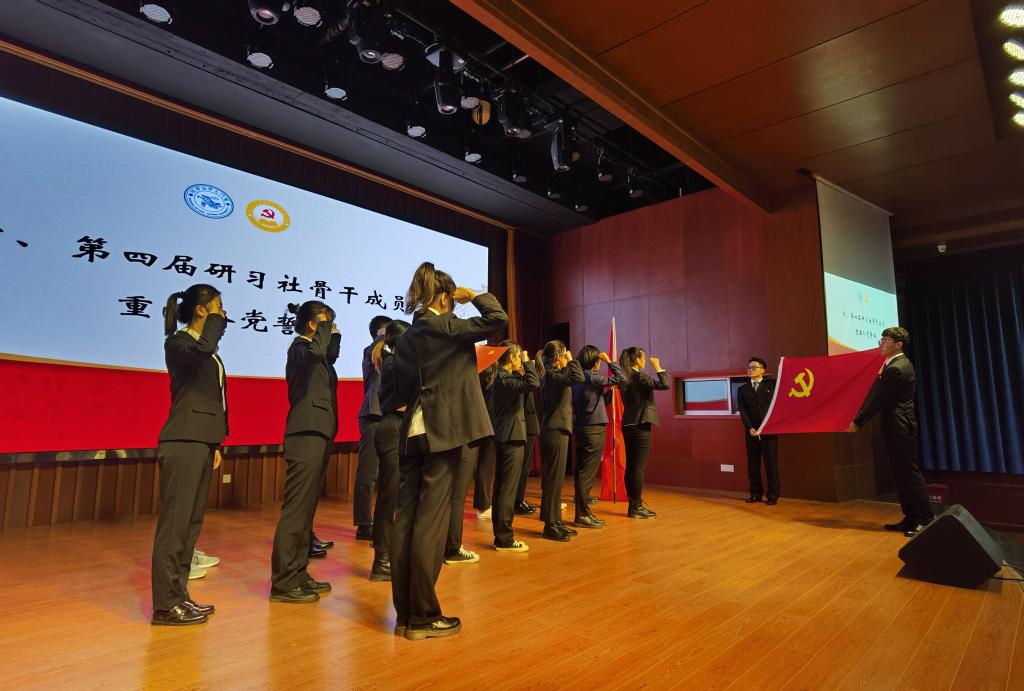 研习社新一届社长张慧蓉与第三届社长徐瑞祥进行社旗交接仪式。张慧蓉带领研习社第四届社团骨干成员重温入党誓词。