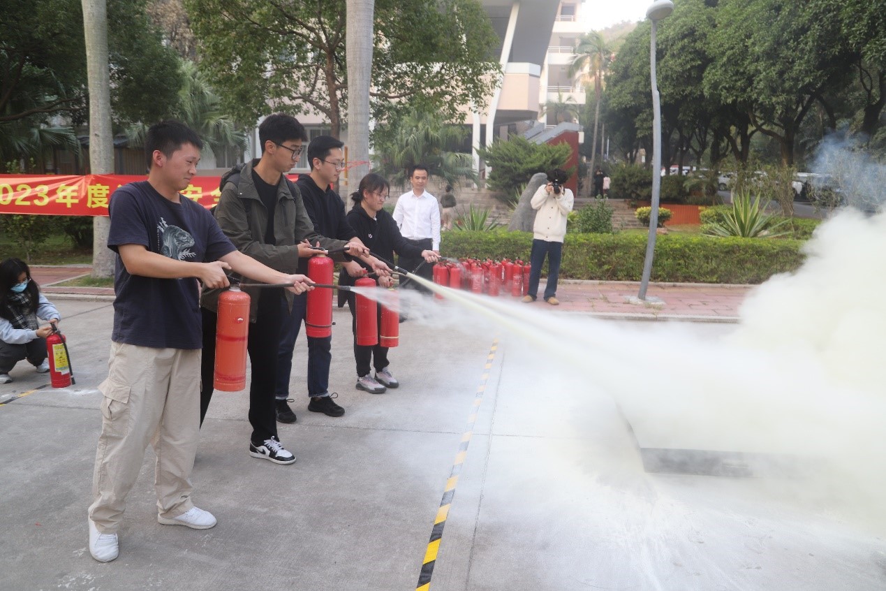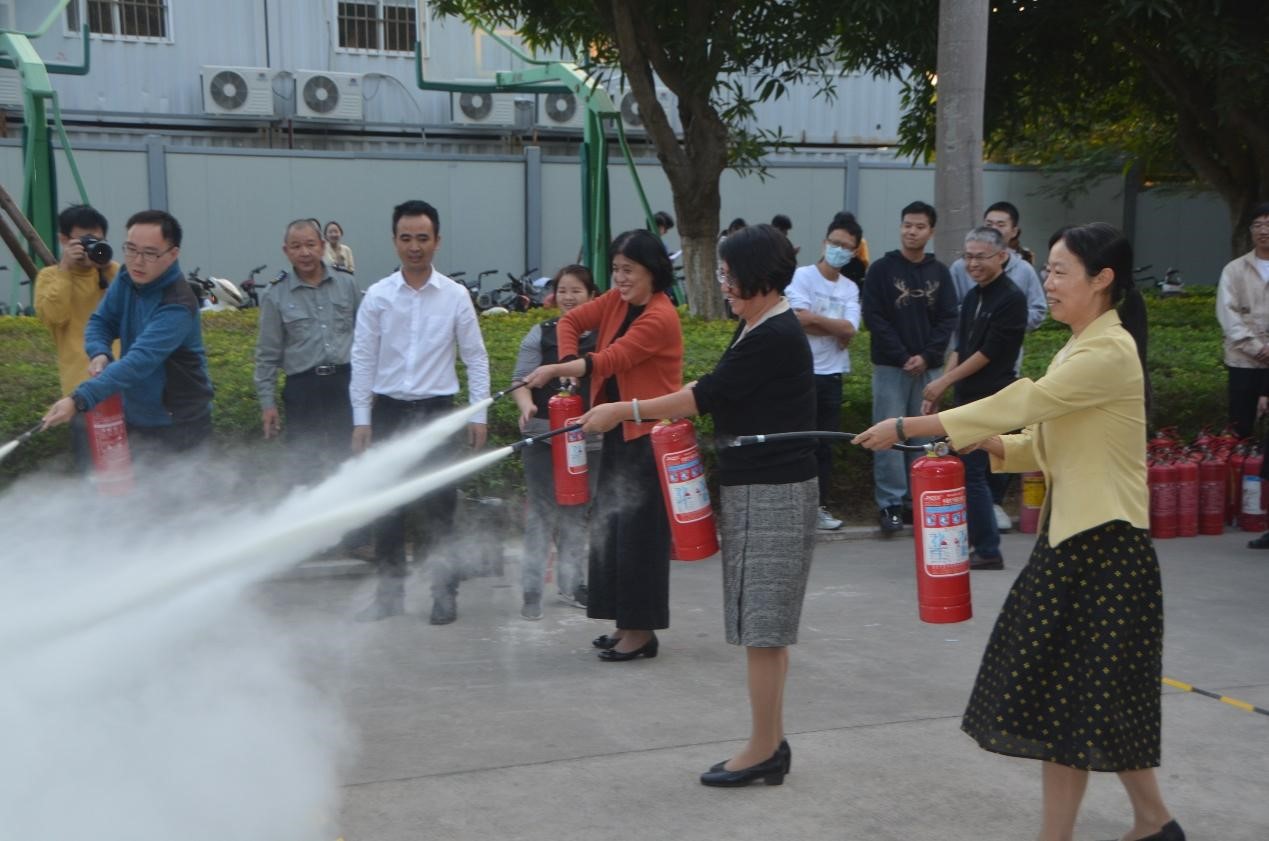 最后的实操演练环节,学院师生按照指导,依次使用干粉灭火器进行灭火实操演练,掌握灭火技能。