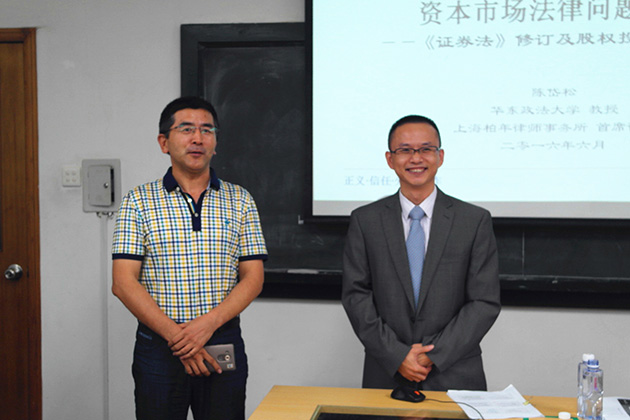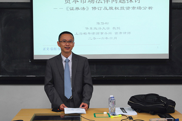 2016年6月2日晚8点,由厦门大学法学院金融法研究中心和福建远大联盟律师事务所联合举办的厦门大学“远大”金融法高端论坛系列讲座之“资本市场法律问题探讨——《证券法》修订及股权投资市场分析”在我院B520教室如期举行。本次讲座有幸邀请到了华东政法大学教授、上海柏年律师事务所首席律师陈岱松老师作为主讲人,厦门大学法学院肖伟教授主持了此次讲座。讲座现场座无虚席,陈岱松老师也知无不言,结合自身丰富的理论知识及实践经验,为同学们带来一场精彩绝伦的讲座。